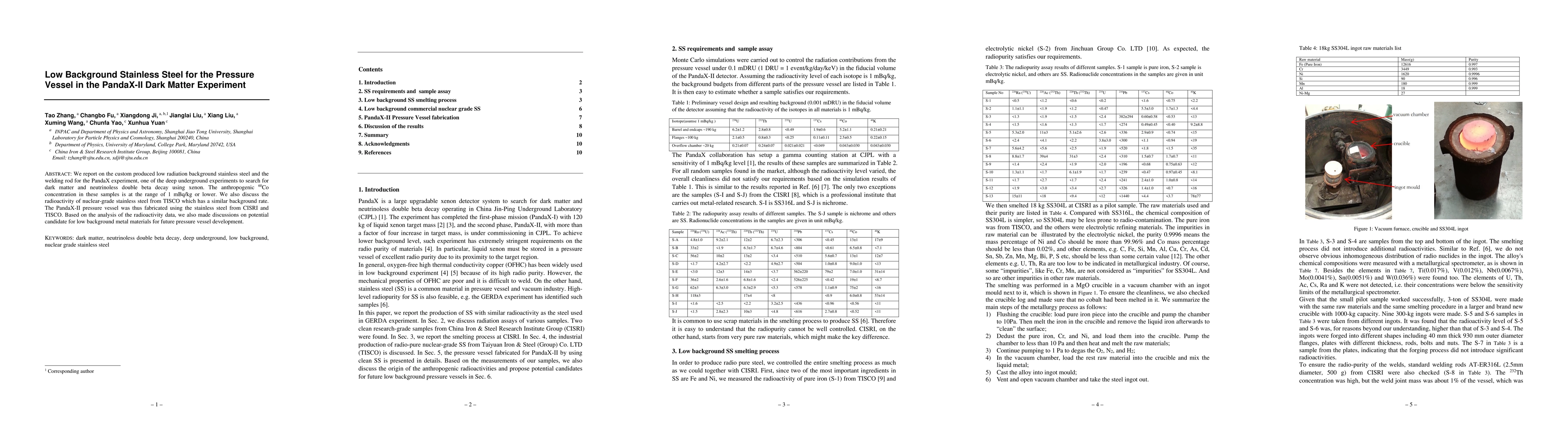 We report on the custom produced low radiation background stainless steel and the welding rod for the PandaX experiment, one of the deep underground experiments to search for dark matter and neutrinoless double beta decay using xenon. The anthropogenic 60 Co concentration in these samples is at the range of 1 mBq/kg or lower. We also discuss the radioactivity of nuclear-grade stainless steel from TISCO which has a similar background rate. The PandaX-II pressure vessel was thus fabricated using the stainless steel from CISRI and TISCO. Based on the analysis of the radioactivity data, we also made discussions on potential candidate for low background metal materials for future pressure vessel development.