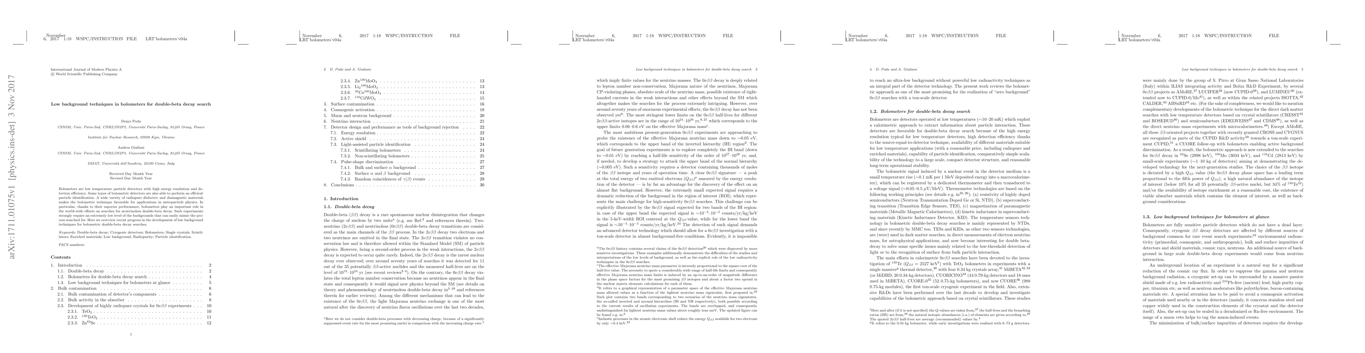 The paper overviews recent progress in low background techniques for bolometric double-beta decay searches, focusing on materials like Li2MoO4, Li2100MoO4, 40Ca100MoO4, and 116CdWO4.