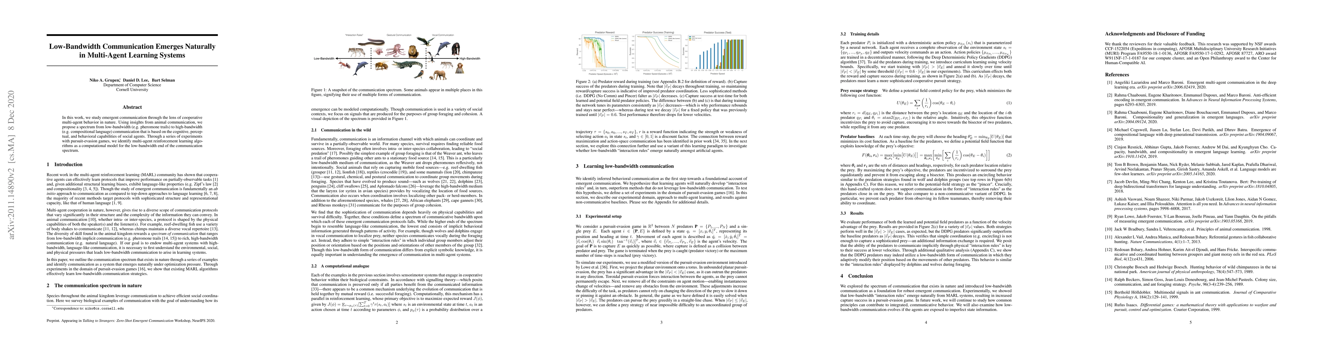 This paper investigates how low-bandwidth communication naturally emerges in multi-agent systems, drawing parallels from animal communication. It identifies multi-agent reinforcement learning algorithms as a model for low-bandwidth communication based on experiments in pursuit-evasion games.