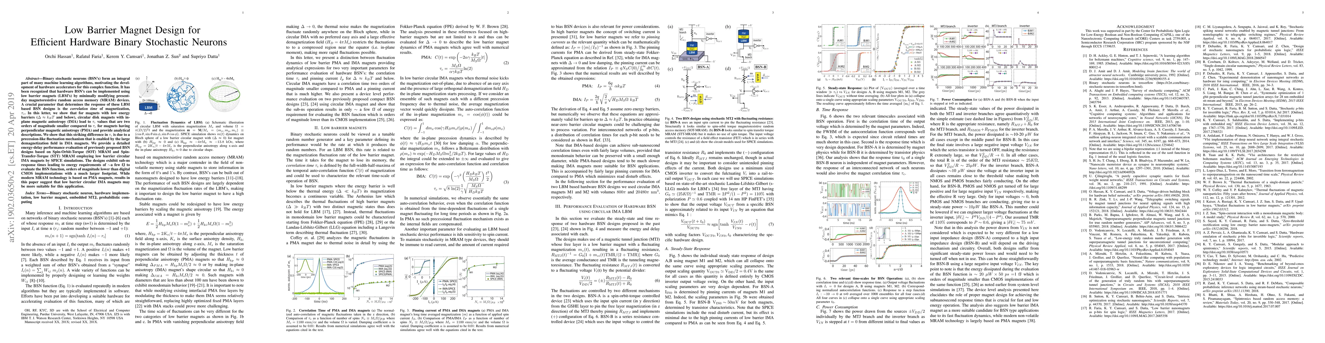This paper proposes low barrier magnets (LBM's) for efficient hardware binary stochastic neurons (BSN's) using circular disk magnets with in-plane magnetic anisotropy (IMA), which exhibit significantly lower correlation time ($\tau_c$) compared to perpendicular magnetic anisotropy (PMA) magnets. The designs achieve sub-nanosecond response times and energy requirements of a few femtojoules, outperforming digital CMOS implementations.