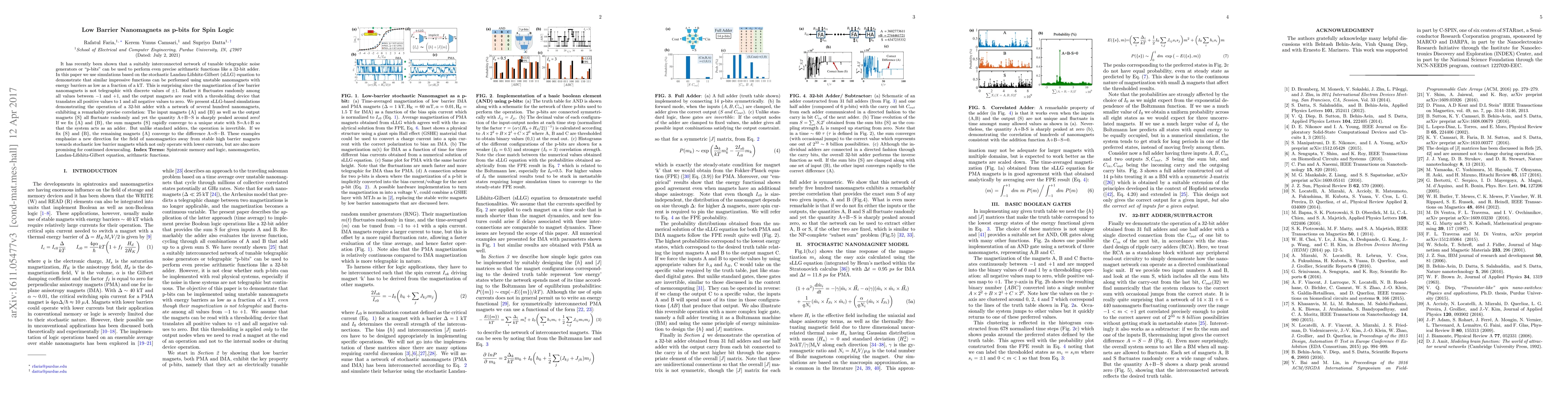 This paper demonstrates that low barrier nanomagnets can function as "p-bits" in spin logic, enabling precise arithmetic operations like a 32-bit adder despite their random magnetization fluctuations. The stochastic Landau-Lifshitz-Gilbert simulations show that these nanomagnets can perform arithmetic functions through thresholding, suggesting a new direction in nanomagnetics towards more scalable and lower-current devices.