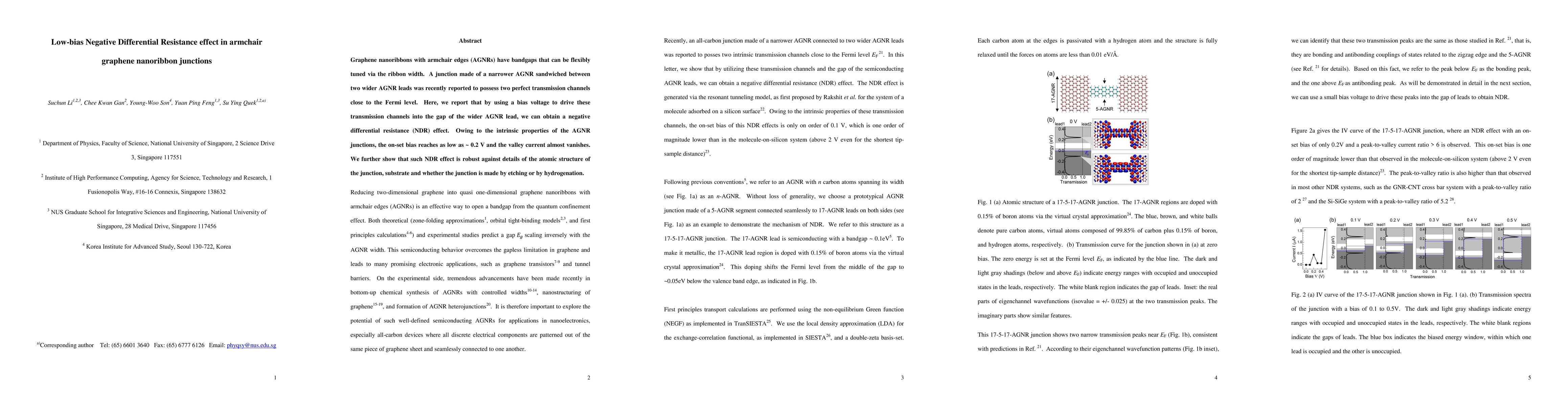 This paper reports a low-bias negative differential resistance effect in armchair graphene nanoribbon junctions, where a narrow ribbon sandwiched between wider ribbons exhibits NDR at low voltages (~0.2 V) due to intrinsic junction properties, remaining robust against structural variations.