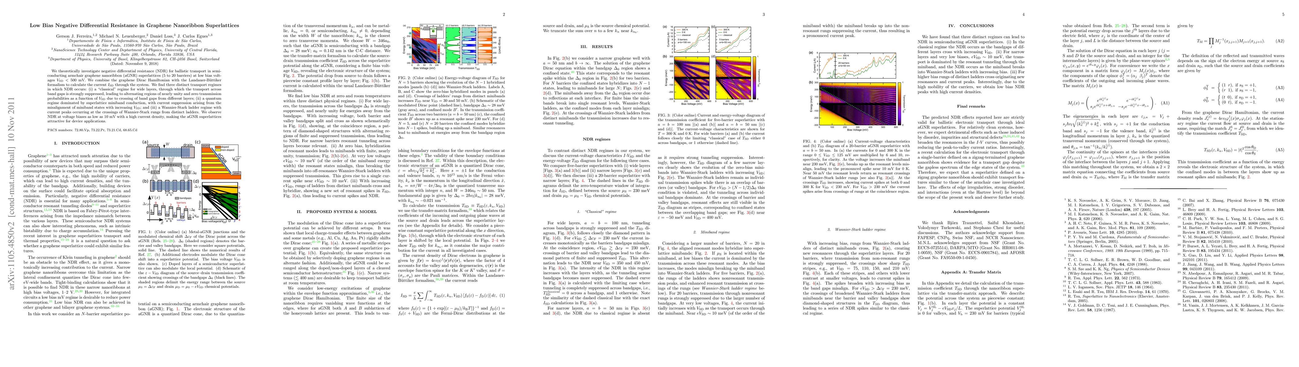 This research explores low bias negative differential resistance (NDR) in semiconducting armchair graphene nanoribbon superlattices, identifying three transport regimes: classical, quantum, and Wannier-Stark ladder. The study finds NDR at low voltages (<500 mV) with high current density, suggesting potential for device applications.