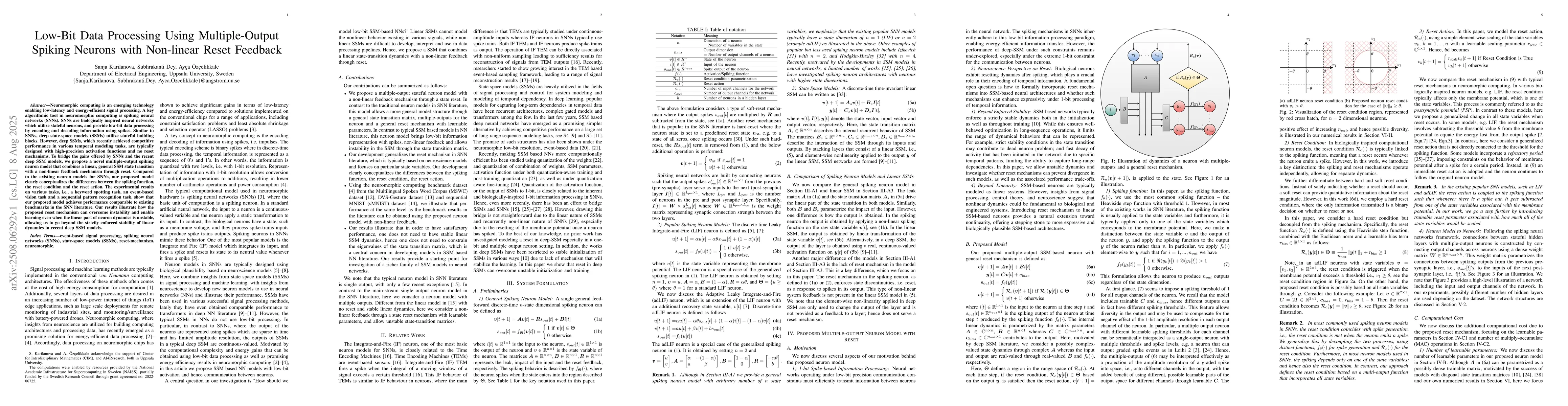 Neuromorphic computing is an emerging technology enabling low-latency and energy-efficient signal processing. A key algorithmic tool in neuromorphic computing is spiking neural networks (SNNs). SNNs are biologically inspired neural networks which utilize stateful neurons, and provide low-bit data processing by encoding and decoding information using spikes. Similar to SNNs, deep state-space models (SSMs) utilize stateful building blocks. However, deep SSMs, which recently achieved competitive performance in various temporal modeling tasks, are typically designed with high-precision activation functions and no reset mechanisms. To bridge the gains offered by SNNs and the recent deep SSM models, we propose a novel multiple-output spiking neuron model that combines a linear, general SSM state transition with a non-linear feedback mechanism through reset. Compared to the existing neuron models for SNNs, our proposed model clearly conceptualizes the differences between the spiking function, the reset condition and the reset action. The experimental results on various tasks, i.e., a keyword spotting task, an event-based vision task and a sequential pattern recognition task, show that our proposed model achieves performance comparable to existing benchmarks in the SNN literature. Our results illustrate how the proposed reset mechanism can overcome instability and enable learning even when the linear part of neuron dynamics is unstable, allowing us to go beyond the strictly enforced stability of linear dynamics in recent deep SSM models.