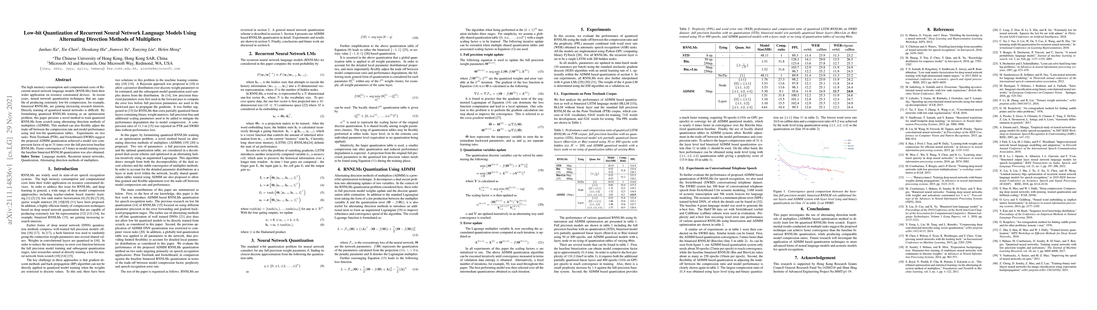 This paper proposes a novel method for training low-bit quantized Recurrent Neural Network Language Models (RNNLMs) using the alternating direction methods of multipliers (ADMM). This approach achieves up to 31 times model size compression and faster convergence compared to baseline binarized RNNLMs.