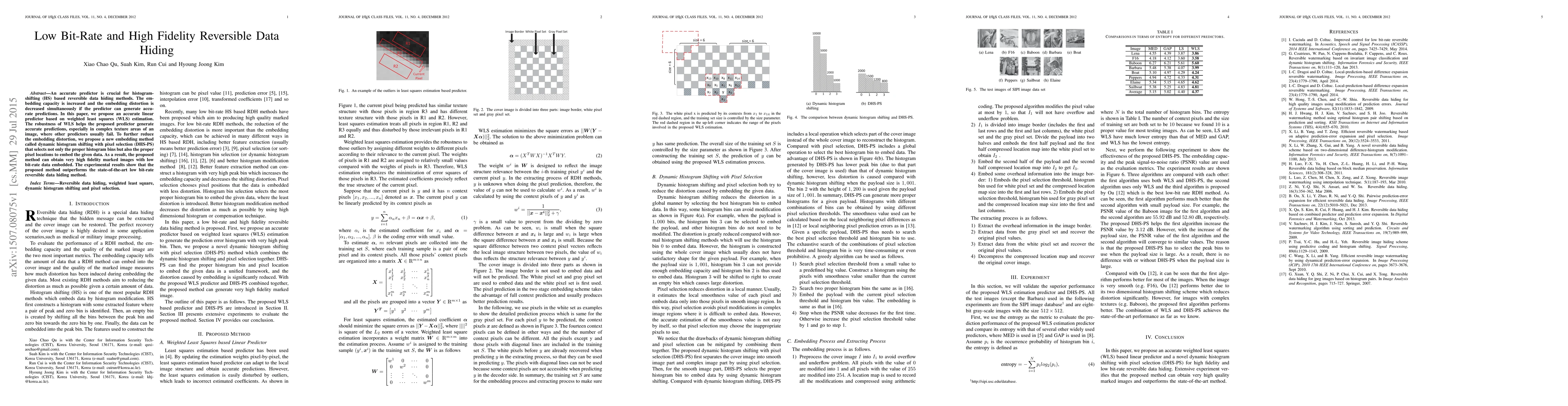 This paper proposes an accurate linear predictor based on weighted least squares for histogram-shifting reversible data hiding, enhancing embedding capacity and reducing distortion. It introduces dynamic histogram shifting with pixel selection to further minimize embedding distortion, achieving high fidelity and low bit-rate data embedding, outperforming existing methods.