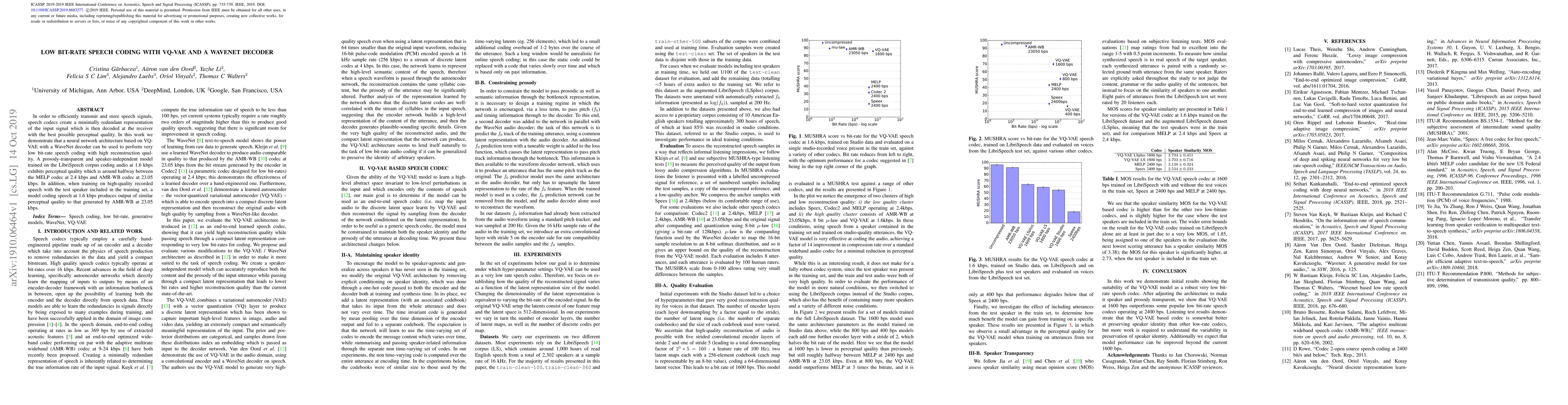 This paper proposes a low bit-rate speech coding method using a VQ-VAE with a WaveNet decoder, achieving high perceptual quality at 1.6 kbps. The model demonstrates comparable performance to higher bit-rate codecs, especially when trained with high-quality speech including the test speaker.