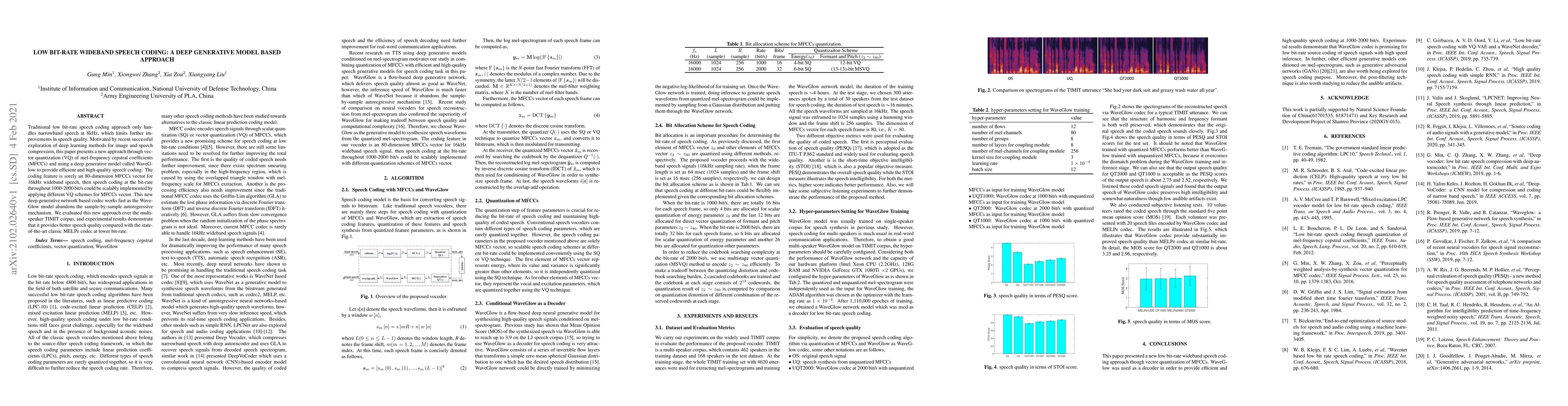 This paper introduces a new deep generative model-based approach for low bit-rate wideband speech coding, employing vector quantization of MFCCs and the WaveGlow model for efficient coding at 16kHz. It outperforms the state-of-the-art MELPe codec in terms of speech quality at lower bit-rates, as demonstrated on the TIMIT corpus.