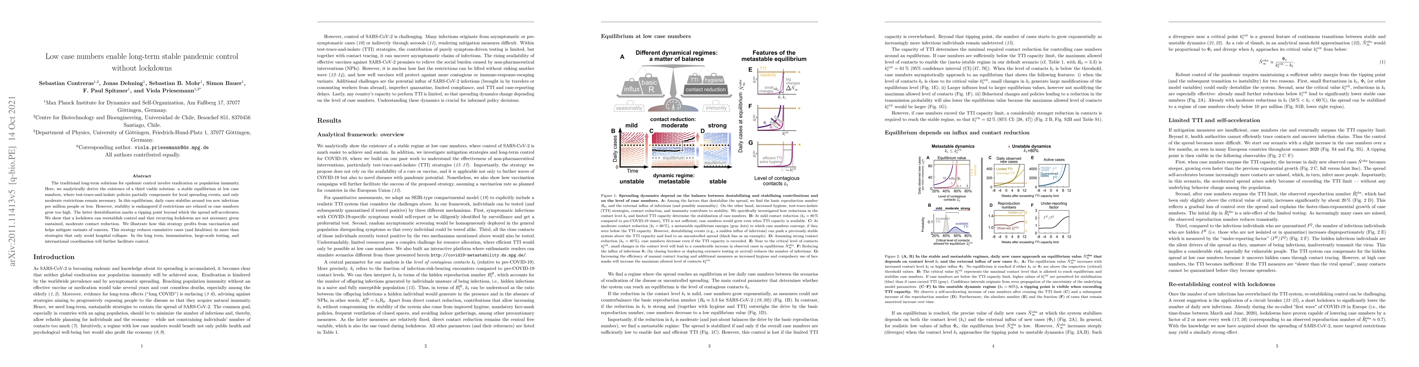 The traditional long-term solutions for epidemic control involve eradication or population immunity. Here, we analytically derive the existence of a third viable solution: a stable equilibrium at low case numbers, where test-trace-and-isolate policies partially compensate for local spreading events, and only moderate restrictions remain necessary. In this equilibrium, daily cases stabilize around ten new infections per million people or less. However, stability is endangered if restrictions are relaxed or case numbers grow too high. The latter destabilization marks a tipping point beyond which the spread self-accelerates. We show that a lockdown can reestablish control and that recurring lockdowns are not necessary given sustained, moderate contact reduction. We illustrate how this strategy profits from vaccination and helps mitigate variants of concern. This strategy reduces cumulative cases (and fatalities) 4x more than strategies that only avoid hospital collapse. In the long term, immunization, large-scale testing, and international coordination will further facilitate control.