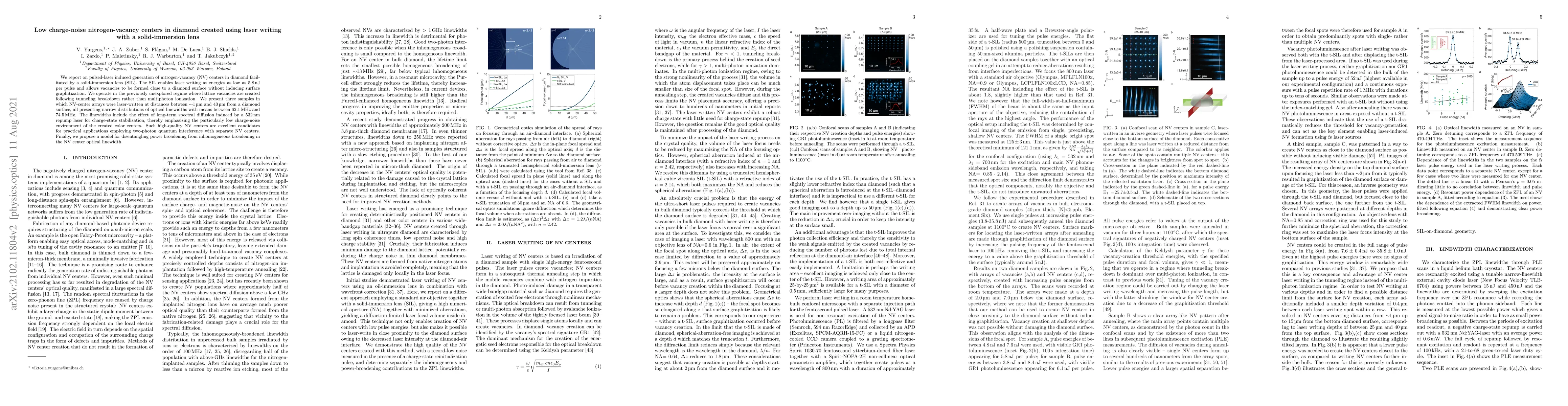 This paper details the creation of high-quality nitrogen-vacancy (NV) centers in diamond using laser writing with a solid-immersion lens, achieving low charge noise and narrow optical linewidths. The method avoids surface graphitization and operates in a new regime of lattice vacancy creation.