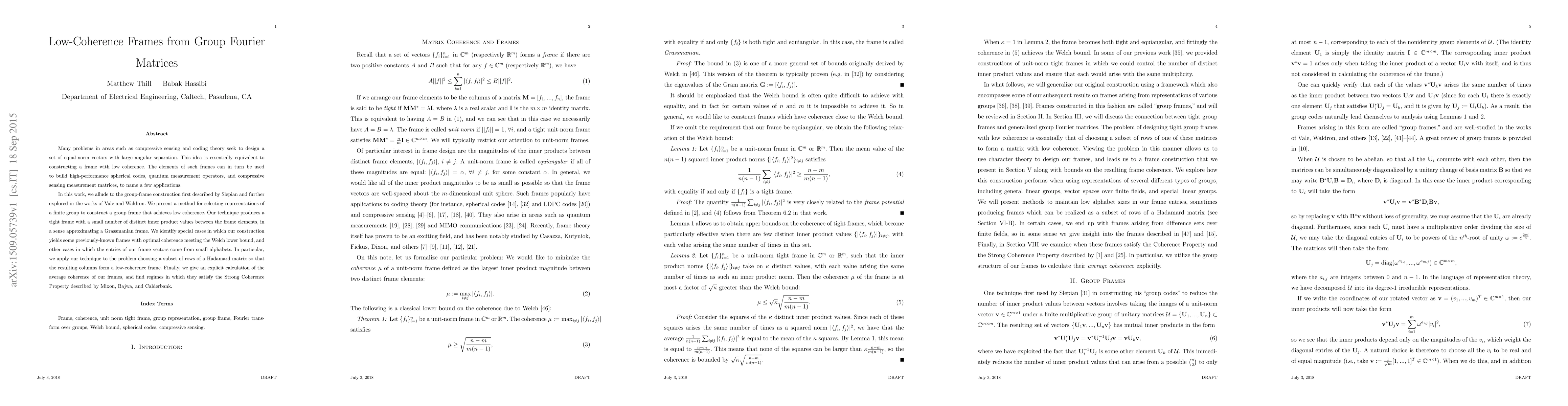 This paper proposes a method to construct low-coherence frames using group Fourier matrices, specifically leveraging group-frame constructions from Slepian and Vale. The technique results in a tight frame with minimal distinct inner product values, achieving optimal coherence in certain cases.