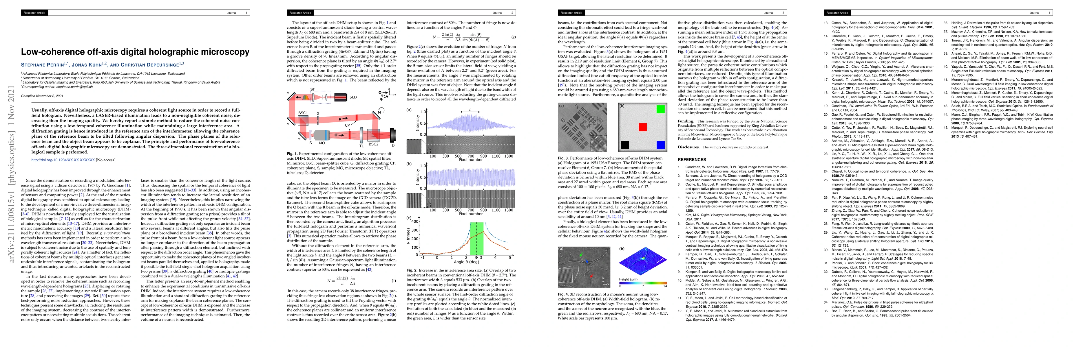 This paper proposes a method to reduce coherent noise in off-axis digital holographic microscopy using low-temporal-coherence illumination, facilitated by a diffraction grating in the reference arm. This approach maintains a large interference area and demonstrates successful three-dimensional reconstruction of biological samples.