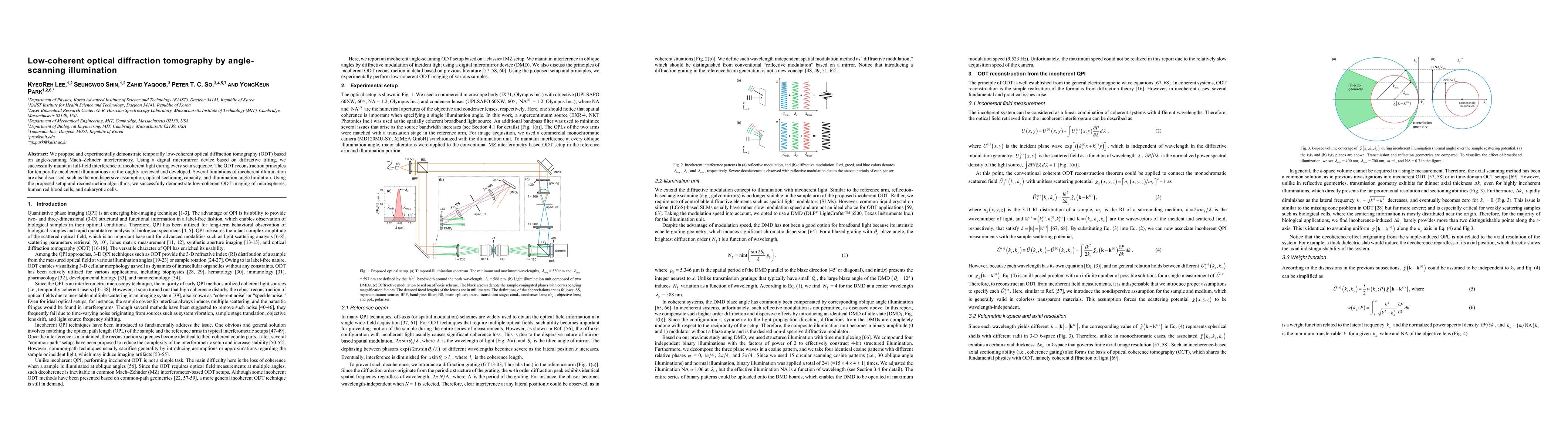 This paper proposes and demonstrates low-coherent optical diffraction tomography (ODT) using angle-scanning Mach-Zehnder interferometry with a digital micromirror device. The study successfully reconstructs images of microspheres, human red blood cells, and eukaryotic cells, while discussing limitations like nondispersive assumptions and optical sectioning capacity.