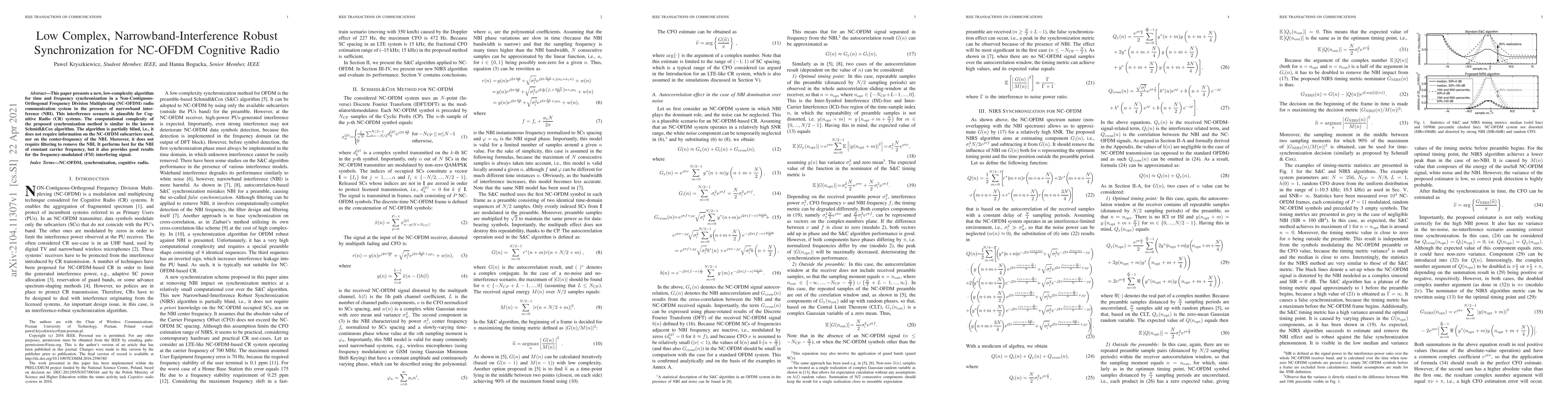 This paper introduces a low-complexity, partially blind synchronization algorithm for NC-OFDM cognitive radio systems, robust against narrowband interference, with computational complexity comparable to the Schmidl&Cox algorithm. It performs optimally for constant frequency NBI and reasonably well for frequency-modulated interference.