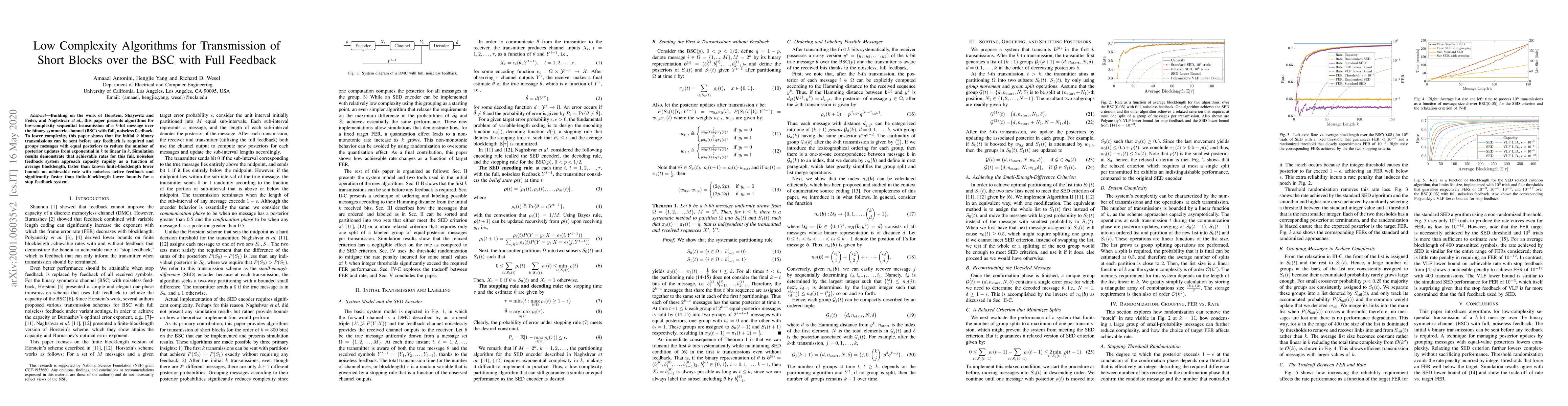 The paper presents low-complexity algorithms for sequential transmission of a k-bit message over the binary symmetric channel (BSC) with full, noiseless feedback. It introduces techniques to reduce complexity by sending the initial k binary transmissions without feedback and grouping messages with equal posteriors to minimize updates.