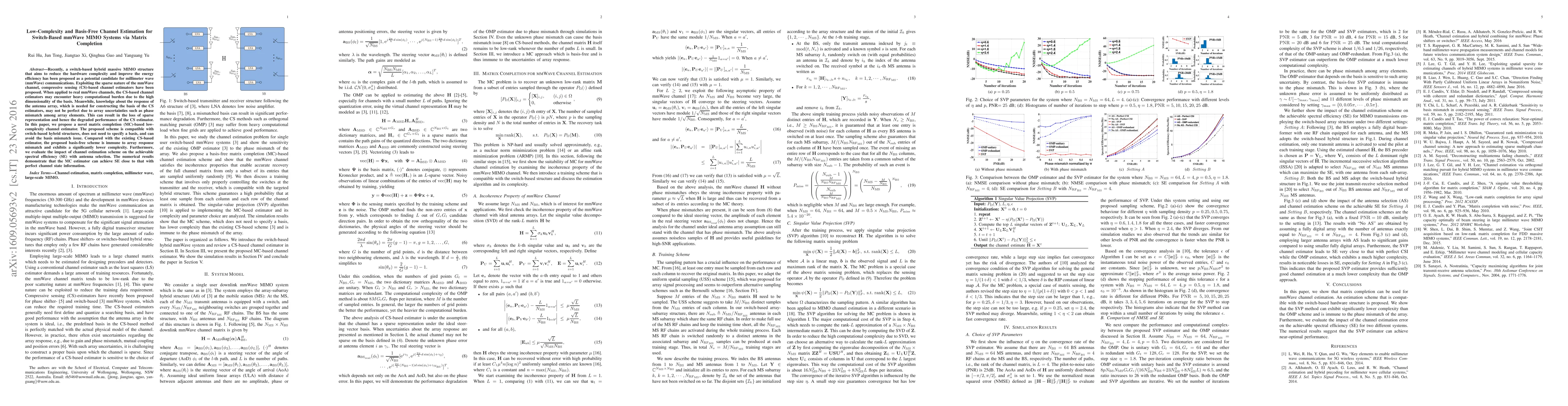 This paper proposes a novel matrix completion-based channel estimator for switch-based hybrid massive MIMO systems in mmWave communications, aiming to reduce complexity without requiring a specific basis, thus avoiding issues related to array response mismatch and achieving lower computational burden.