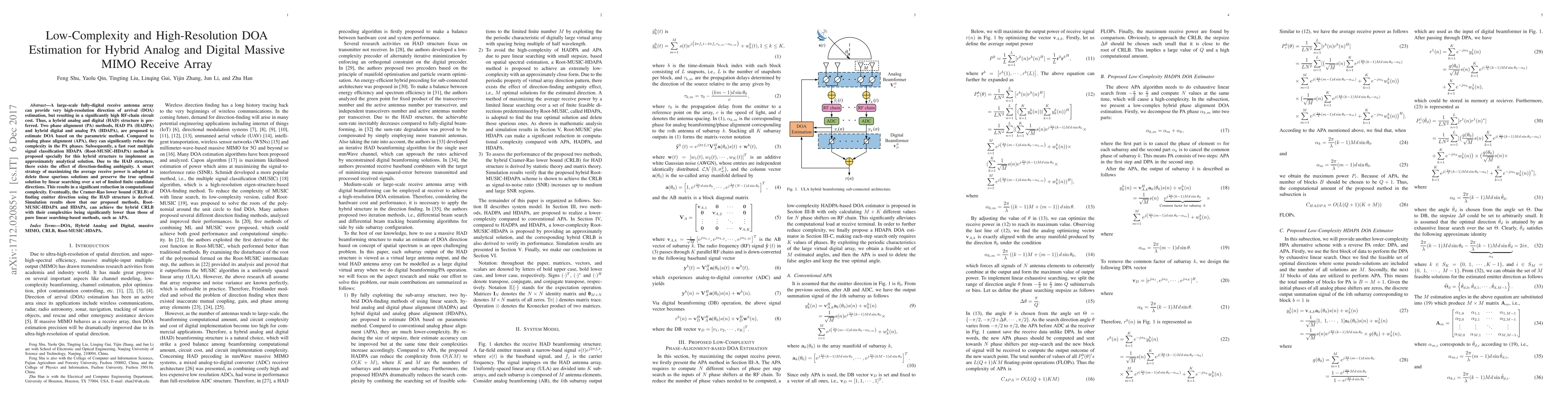 A large-scale fully-digital receive antenna array can provide very high-resolution direction of arrival (DOA) estimation, but resulting in a significantly high RF-chain circuit cost. Thus, a hybrid analog and digital (HAD) structure is preferred. Two phase alignment (PA) methods, HAD PA (HADPA) and hybrid digital and analog PA (HDAPA), are proposed to estimate DOA based on the parametric method. Compared to analog phase alignment (APA), they can significantly reduce the complexity in the PA phases. Subsequently, a fast root multiple signal classification HDAPA (Root-MUSIC-HDAPA) method is proposed specially for this hybrid structure to implement an approximately analytical solution. Due to the HAD structure, there exists the effect of direction-finding ambiguity. A smart strategy of maximizing the average receive power is adopted to delete those spurious solutions and preserve the true optimal solution by linear searching over a set of limited finite candidate directions. This results in a significant reduction in computational complexity. Eventually, the Cramer-Rao lower bound (CRLB) of finding emitter direction using the HAD structure is derived. Simulation results show that our proposed methods, Root-MUSIC-HDAPA and HDAPA, can achieve the hybrid CRLB with their complexities being significantly lower than those of pure linear searching-based methods, such as APA.