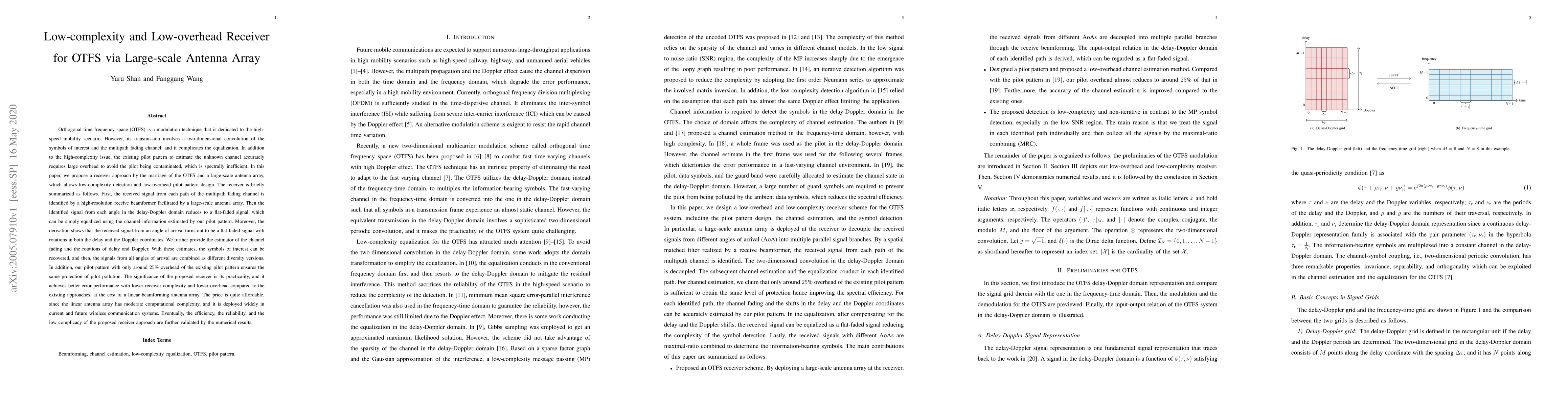 This paper proposes a low-complexity receiver for OTFS using a large-scale antenna array, which simplifies equalization and reduces pilot overhead. The approach identifies signals via a high-resolution beamformer, converts them to flat-faded signals, and employs a pilot pattern with only 25% of the overhead of existing methods, ensuring efficient and reliable symbol recovery.
