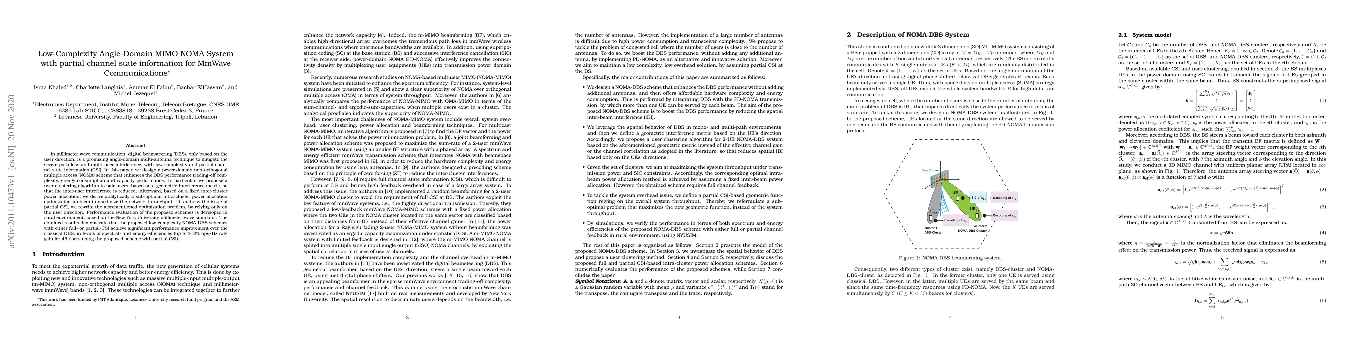 In millimeter-wave communication, digital beamsteering (DBS), only based on the user direction, is a promising angle-domain multi-antenna technique to mitigate the severe path loss and multiuser interference, with low-complexity and partial channel state information (CSI). In this paper, we design a power-domain non-orthogonal multiple access (NOMA) scheme that enhances the DBS performance trading-off complexity , energy-consumption and capacity performance. In particular, we propose a user-clustering algorithm to pair users, based on a geometric-interference metric, so that the inter-user interference is reduced. Afterward, based on a fixed inter-cluster power allocation, we derive analytically a sub-optimal intra-cluster power allocation optimization problem to maximize the network throughput. To address the issue of partial CSI, we rewrite the aforementioned optimization problem, by relying only on the user direction. Performance evaluation of the proposed schemes is developed in rural environment, based on the New York University millimeter-wave simulator. The obtained results demonstrate that the proposed low-complexity NOMA-DBS schemes with either full-or partial-CSI achieve significant performance improvement over the classical DBS, in terms of spectral-and energy-efficiencies (up to 26.8% bps/Hz rate gain for 45 users using the proposed scheme with partial CSI).