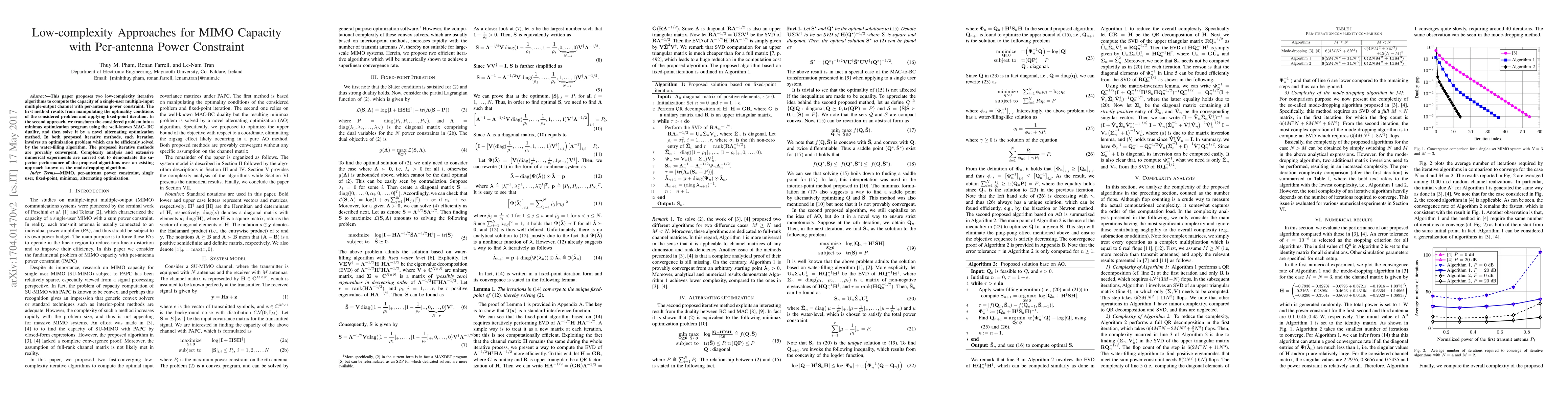 This paper introduces two low-complexity iterative algorithms for computing MIMO channel capacity under per-antenna power constraints, leveraging fixed-point iteration and an alternating optimization method. Both methods utilize the water-filling algorithm and are shown to outperform the mode-dropping algorithm in complexity and performance.