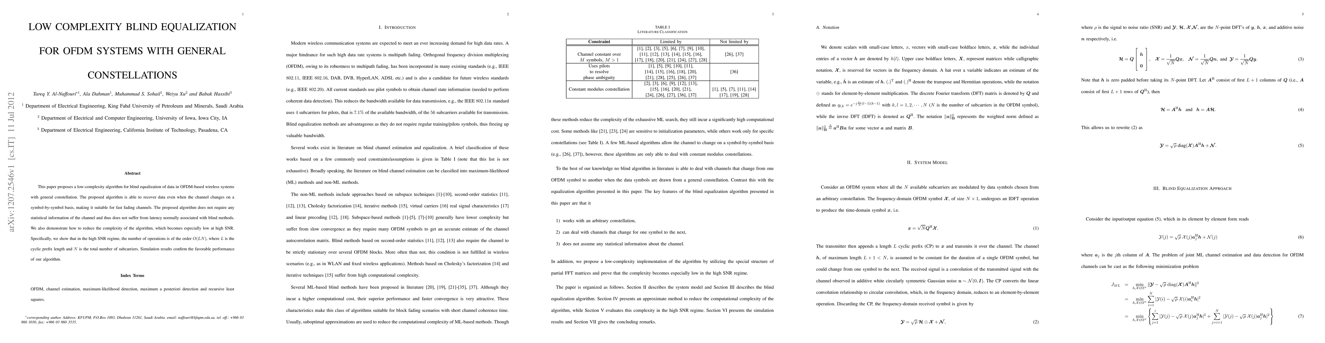 A low-complexity algorithm is proposed for blind equalization in OFDM systems with general constellations, enabling data recovery even in fast-fading channels without requiring channel statistical information.