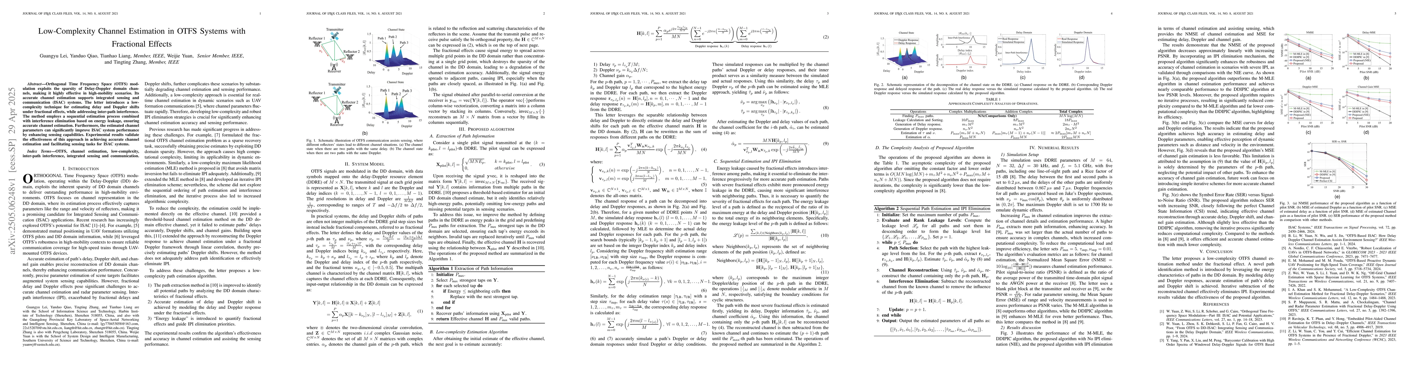 A novel sequential estimation process combined with energy leakage-based interference elimination for low-complexity channel estimation in OTFS systems under fractional effects.
