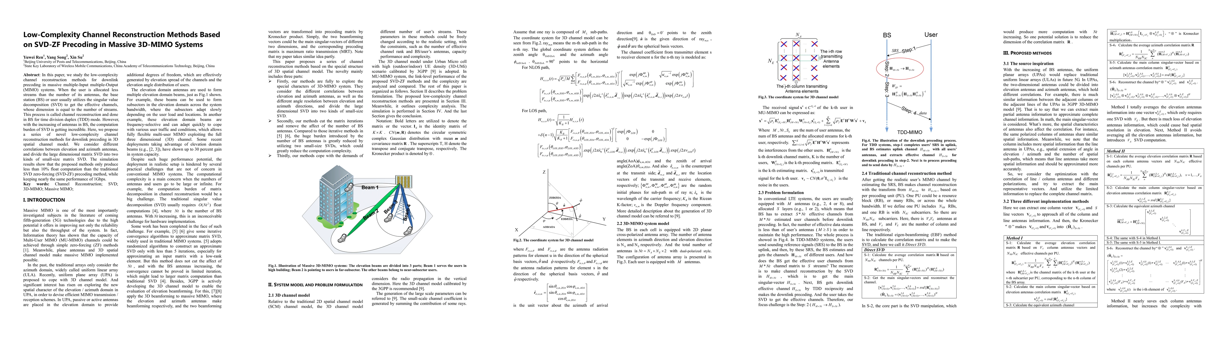 Researchers propose low-complexity channel reconstruction methods for massive 3D-MIMO systems, reducing computation burden while maintaining performance, and achieving only a 10% increase in float computations compared to traditional SVD-ZF precoding.