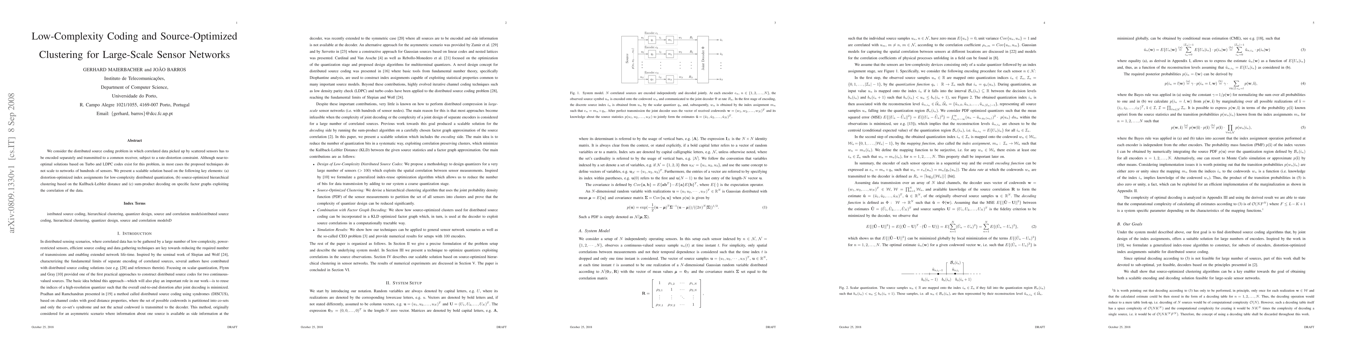 This research introduces a scalable solution for distributed source coding in large sensor networks, utilizing distortion-optimized index assignments, source-optimized hierarchical clustering, and sum-product decoding. It aims to address the limitations of existing techniques for networks with hundreds of sensors.