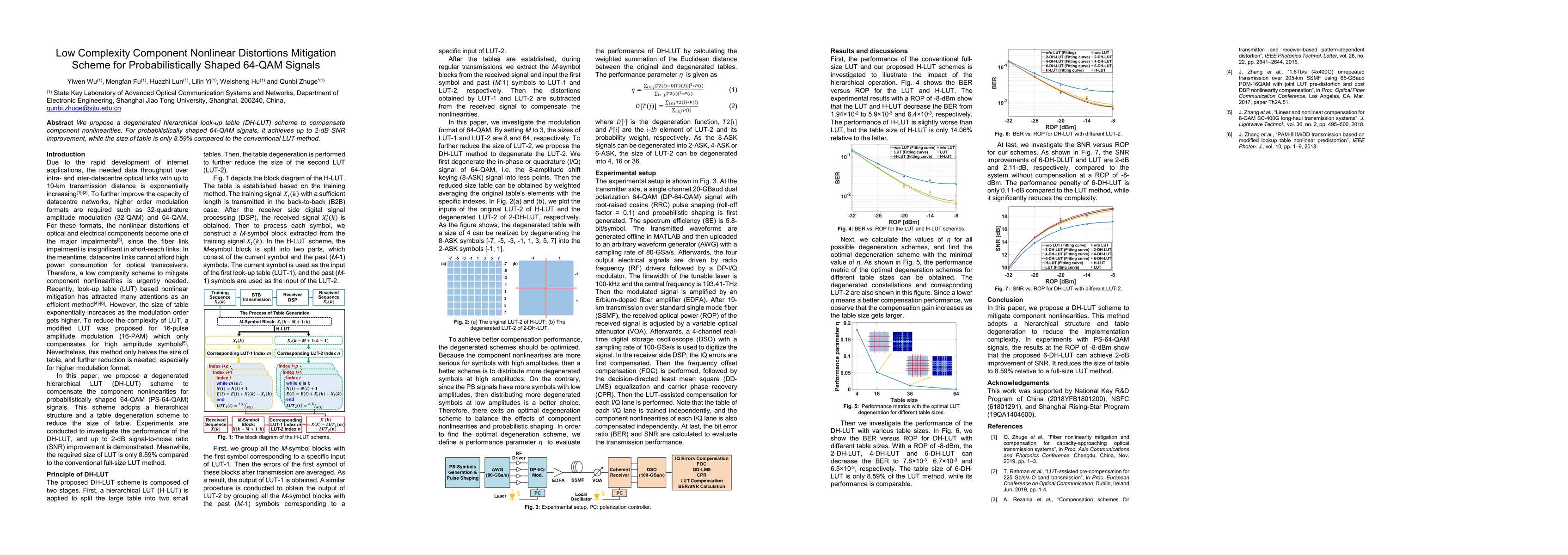 We propose a degenerated hierarchical look-up table (DH-LUT) scheme to compensate component nonlinearities. For probabilistically shaped 64-QAM signals, it achieves up to 2-dB SNR improvement, while the size of table is only 8.59% compared to the conventional LUT method.
