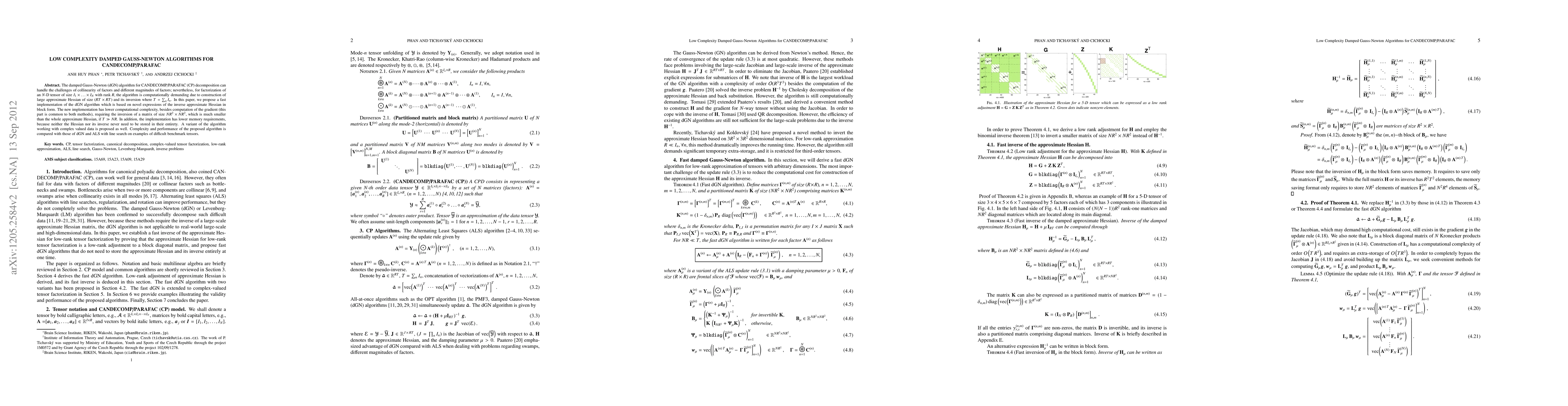 This paper proposes a low-complexity variant of the damped Gauss-Newton algorithm for CANDECOMP/PARAFAC decomposition, reducing the inversion of a large approximate Hessian to a smaller matrix, thus lowering computational and memory requirements. The new implementation is compared with standard dGN and ALS methods on benchmark tensors.