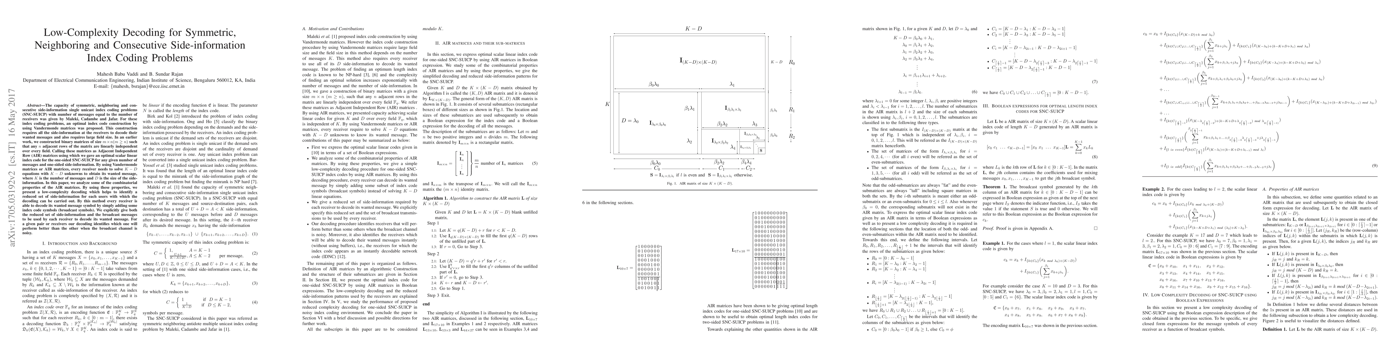 The capacity of symmetric, neighboring and consecutive side-information single unicast index coding problems (SNC-SUICP) with number of messages equal to the number of receivers was given by Maleki, Cadambe and Jafar. For these index coding problems, an optimal index code construction by using Vandermonde matrices was proposed. This construction requires all the side-information at the receivers to decode their wanted messages and also requires large field size. In an earlier work, we constructed binary matrices of size $m \times n (m\geq n)$ such that any $n$ adjacent rows of the matrix are linearly independent over every field. Calling these matrices as Adjacent Independent Row (AIR) matrices using which we gave an optimal scalar linear index code for the one-sided SNC-SUICP for any given number of messages and one-sided side-information. By using Vandermonde matrices or AIR matrices, every receiver needs to solve $K-D$ equations with $K-D$ unknowns to obtain its wanted message, where $K$ is the number of messages and $D$ is the size of the side-information. In this paper, we analyze some of the combinatorial properties of the AIR matrices. By using these properties, we present a low-complexity decoding which helps to identify a reduced set of side-information for each users with which the decoding can be carried out. By this method every receiver is able to decode its wanted message symbol by simply adding some index code symbols (broadcast symbols). We explicitly give both the reduced set of side-information and the broadcast messages to be used by each receiver to decode its wanted message. For a given pair or receivers our decoding identifies which one will perform better than the other when the broadcast channel is noisy.