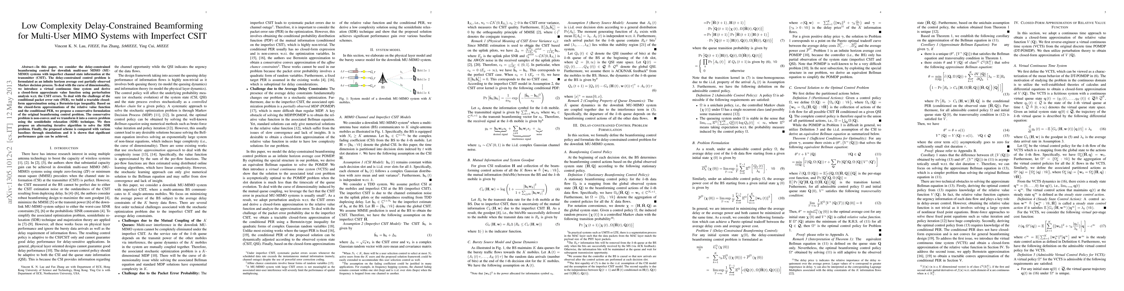 This paper proposes a low complexity, delay-constrained beamforming method for multi-user MIMO systems with imperfect CSIT, transforming a non-convex problem into a convex one via semidefinite relaxation and solving it using an iterative algorithm. Simulation results demonstrate significant performance improvements compared to baselines.