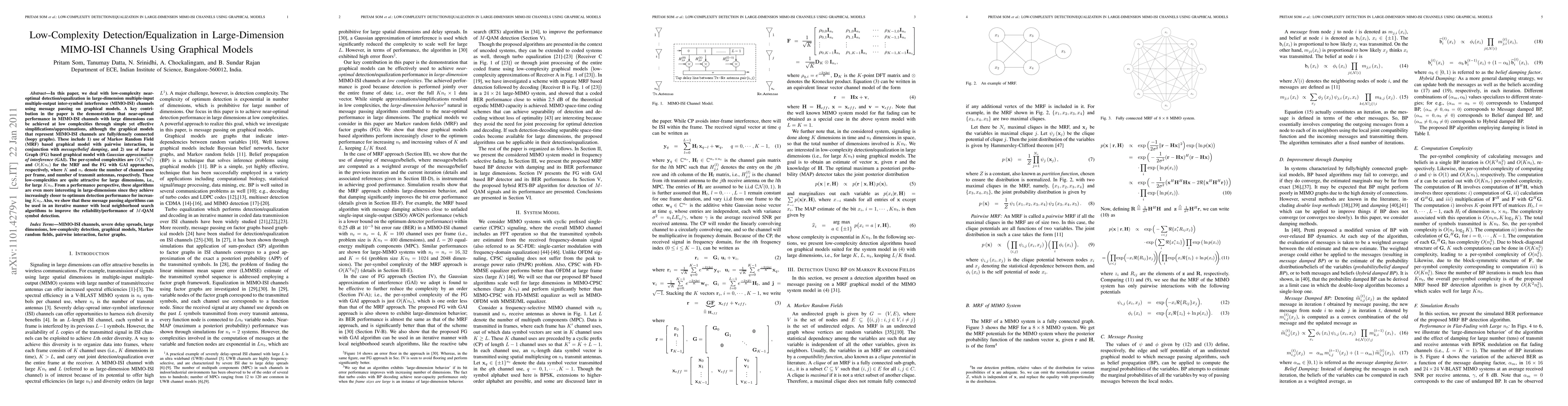 This paper proposes low-complexity detection/equalization methods for large-dimension MIMO-ISI channels using graphical models, achieving near-optimal performance through simplifications. The methods include MRF-based graphical models with message damping and Factor Graph-based models with Gaussian interference approximation, resulting in per-symbol complexities of $O(K^2n_t^2)$ and $O(Kn_t)$ respectively, which are effective for large dimensions.