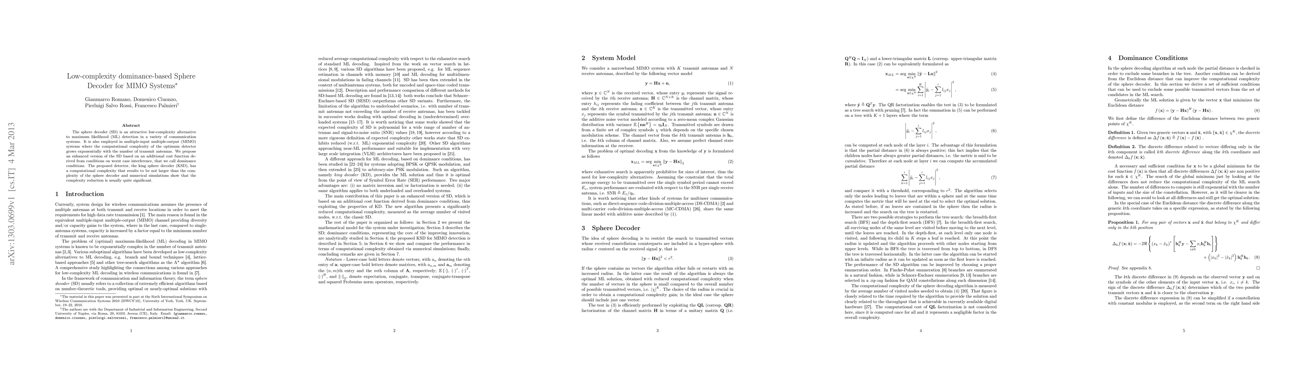The paper proposes a low-complexity dominance-based sphere decoder, called the king sphere decoder (KSD), for MIMO systems, which offers significant complexity reduction compared to the standard sphere decoder while maintaining performance. The KSD leverages dominance conditions derived from worst case interference to achieve this efficiency.