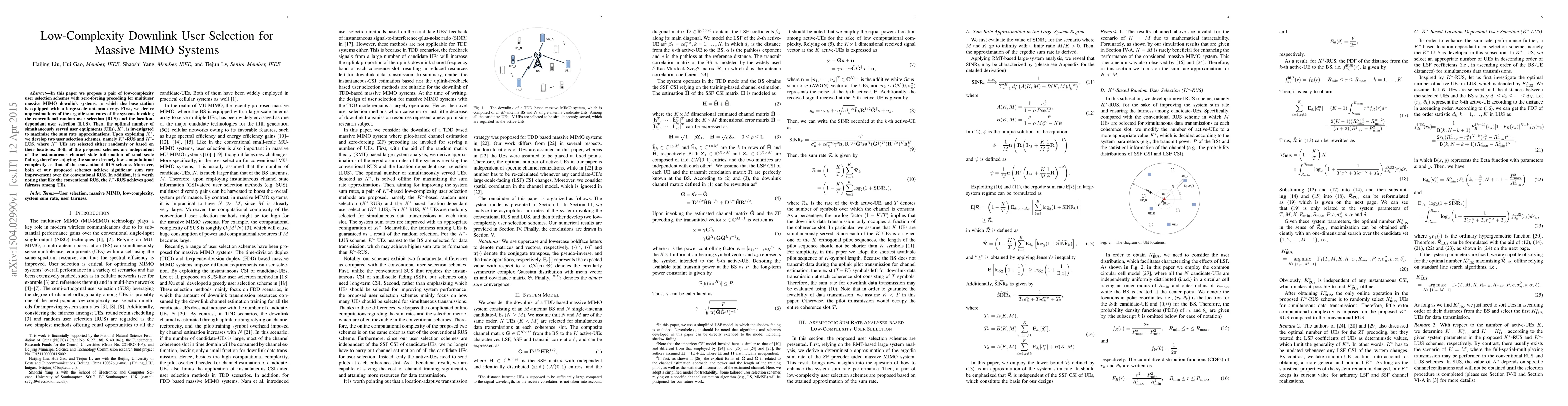 This paper proposes two low-complexity user selection schemes, $K^*$-RUS and $K^*$-LUS, for massive MIMO systems to maximize sum rate with minimal computational complexity. Both schemes outperform conventional random user selection while maintaining fairness among users.