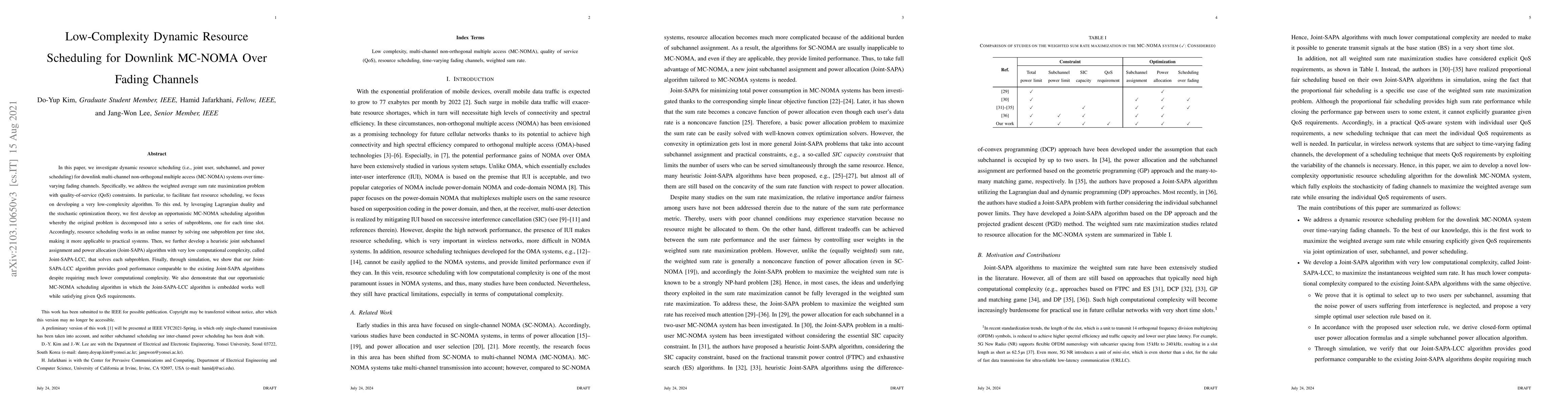 This paper proposes a low-complexity dynamic resource scheduling algorithm for downlink multi-channel non-orthogonal multiple access (MC-NOMA) over fading channels, focusing on maximizing weighted average sum rate with QoS constraints. The developed algorithm leverages Lagrangian duality and stochastic optimization to efficiently solve the scheduling problem in an online manner.