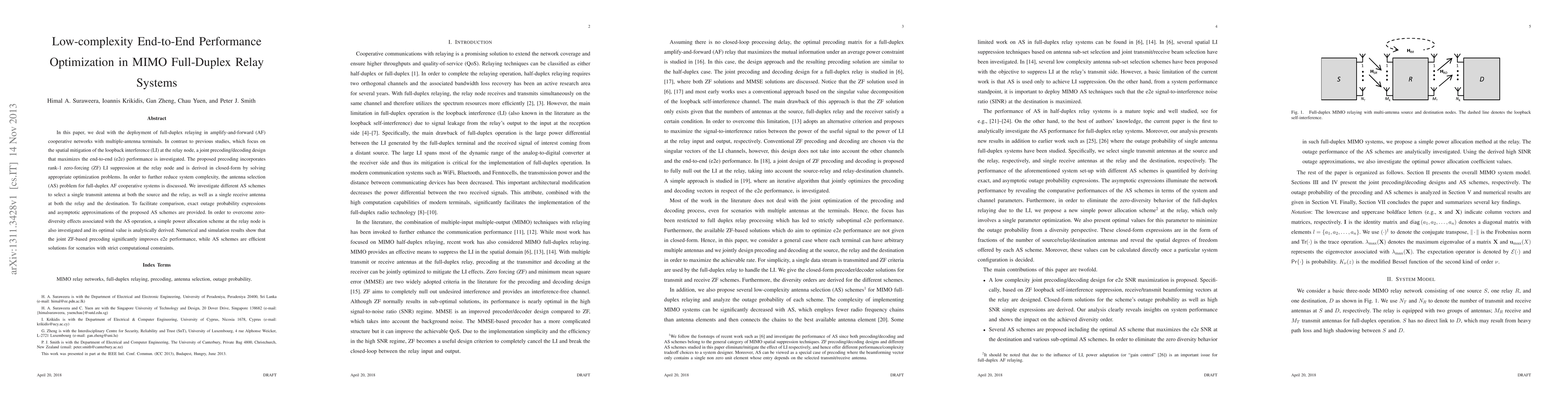This paper proposes a low-complexity joint precoding/decoding design for MIMO full-duplex relay systems to optimize end-to-end performance, incorporating rank-1 zero-forcing interference suppression and antenna selection to reduce complexity. Numerical results show significant performance gains with efficient solutions for scenarios with computational constraints.