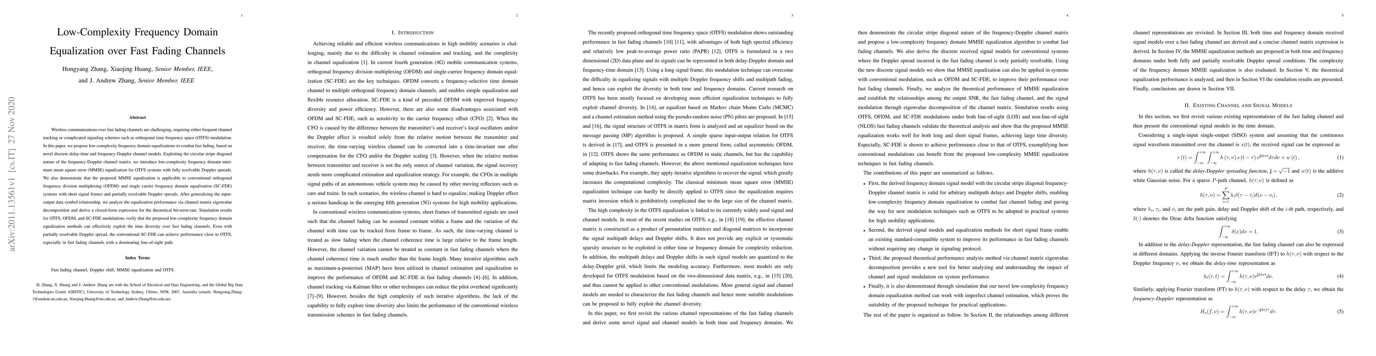 This paper proposes low-complexity frequency domain equalization techniques for combating fast fading in wireless communications, leveraging novel channel models and exploiting the circular stripe diagonal nature of the frequency-Doppler channel matrix. The methods are shown to effectively enhance performance across OTFS, OFDM, and SC-FDE systems, especially in scenarios with a dominating line-of-sight path.