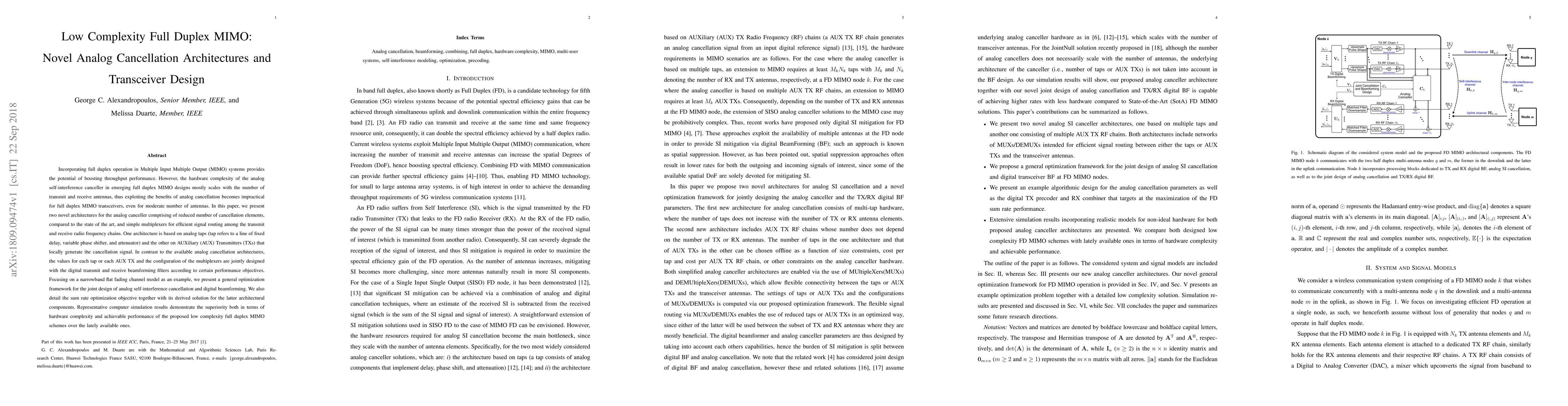This paper proposes novel low complexity analog cancellation architectures for full duplex MIMO systems to reduce hardware complexity and improve throughput. The designs utilize either analog taps or auxiliary transmitters, jointly optimized with digital beamforming for performance objectives, demonstrating superior complexity and performance compared to existing methods.