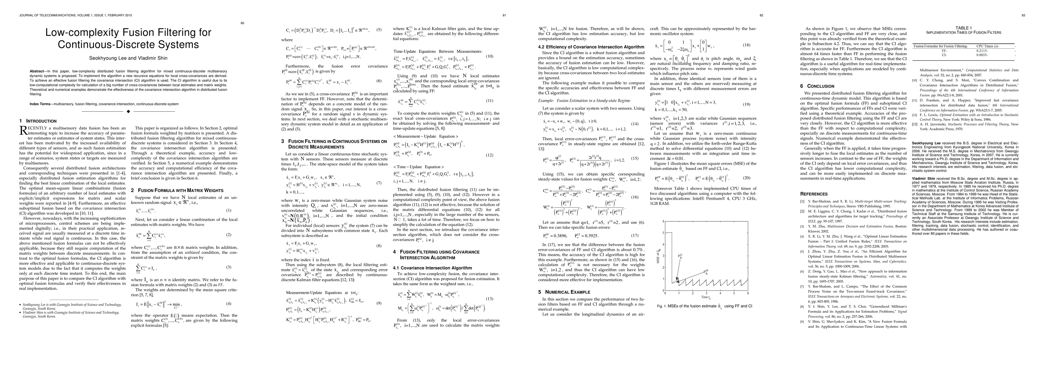 This paper proposes a low-complexity distributed fusion filtering algorithm for mixed continuous-discrete multisensory systems, utilizing a new recursive method for local cross-covariances and the computationally efficient covariance intersection (CI) algorithm for effective fusion filtering. Theoretical and numerical examples validate the CI algorithm's effectiveness.