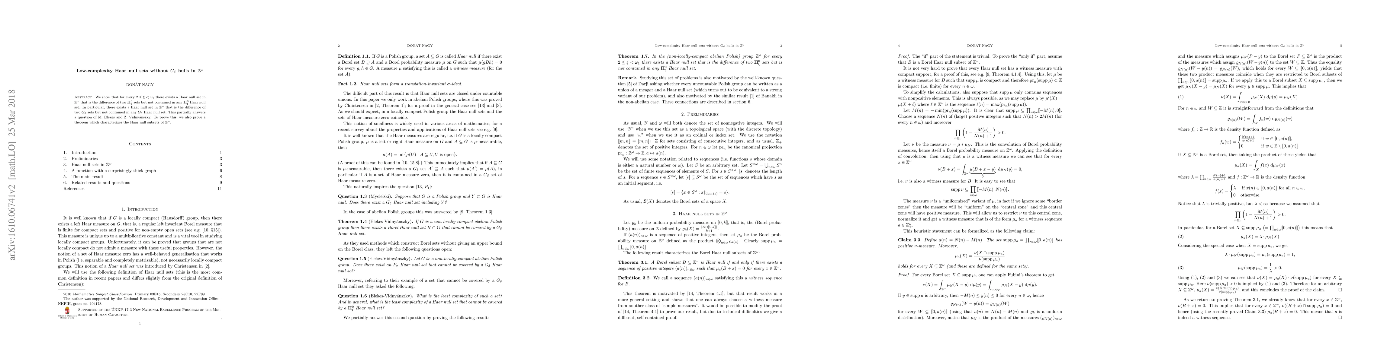The research extends previous work by providing concrete examples of low-complexity Haar null sets without Gδ hulls in Z^ω, answering a question posed by M. Elekes and Z. Vidnyánszky, and contributes to the descriptive set theory within Polish groups.