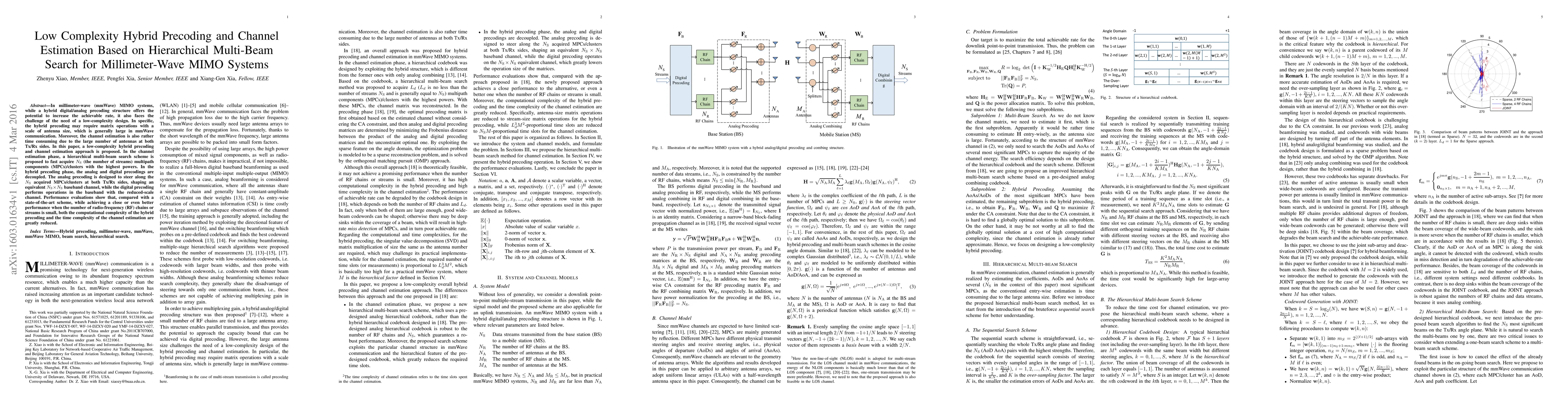 This paper proposes a low-complexity hybrid precoding and channel estimation method for millimeter-wave MIMO systems using a hierarchical multi-beam search for fast channel estimation. The approach decouples analog and digital precoding, significantly reducing computational and time complexity while maintaining performance.