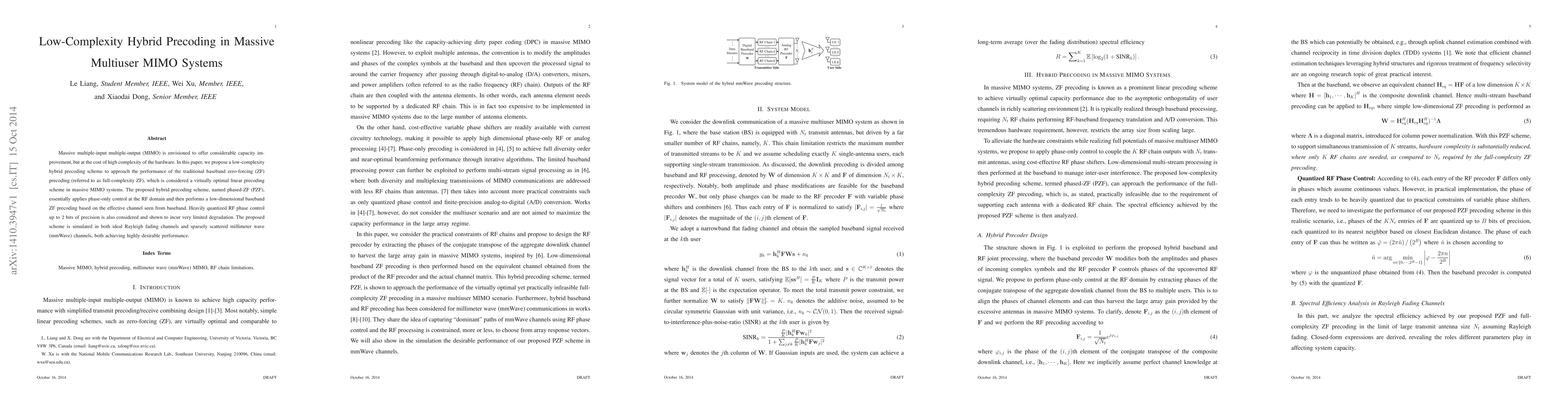 This paper proposes a low-complexity hybrid precoding scheme called phased-ZF (PZF) for massive MIMO systems, which combines phase-only control at the RF domain with low-dimensional baseband zero-forcing precoding, achieving near-optimal performance with significantly reduced complexity compared to full-complexity ZF precoding.