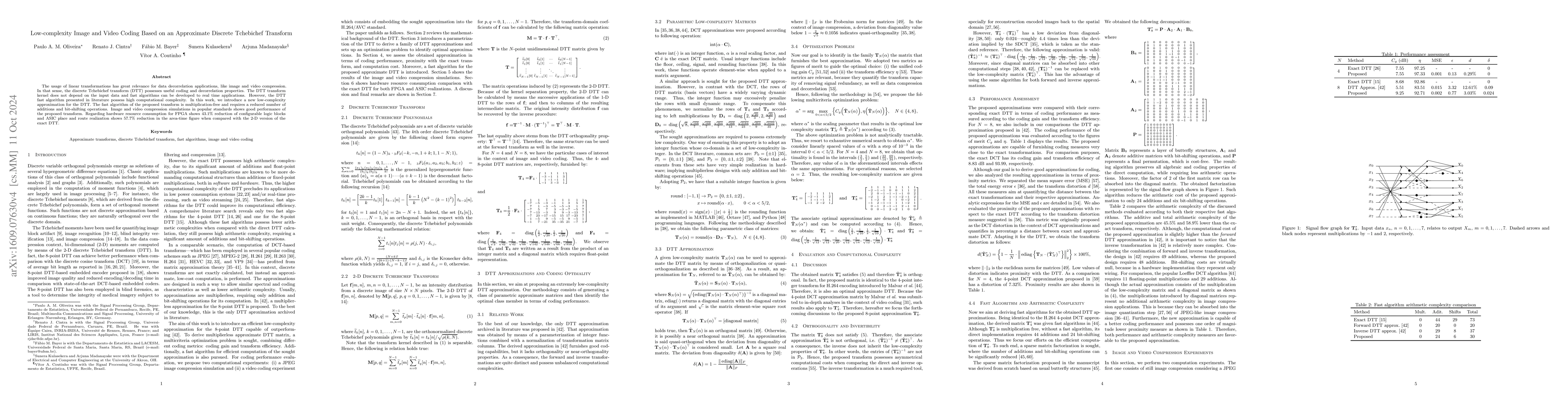 This paper presents a low-complexity approximation of the discrete Tchebichef transform (DTT) for real-time image and video coding, featuring a multiplication-free algorithm with reduced additions and bit-shifting operations. Simulations demonstrate its efficiency, and hardware evaluations show significant reductions in FPGA resources and ASIC area-time product compared to the exact DTT.