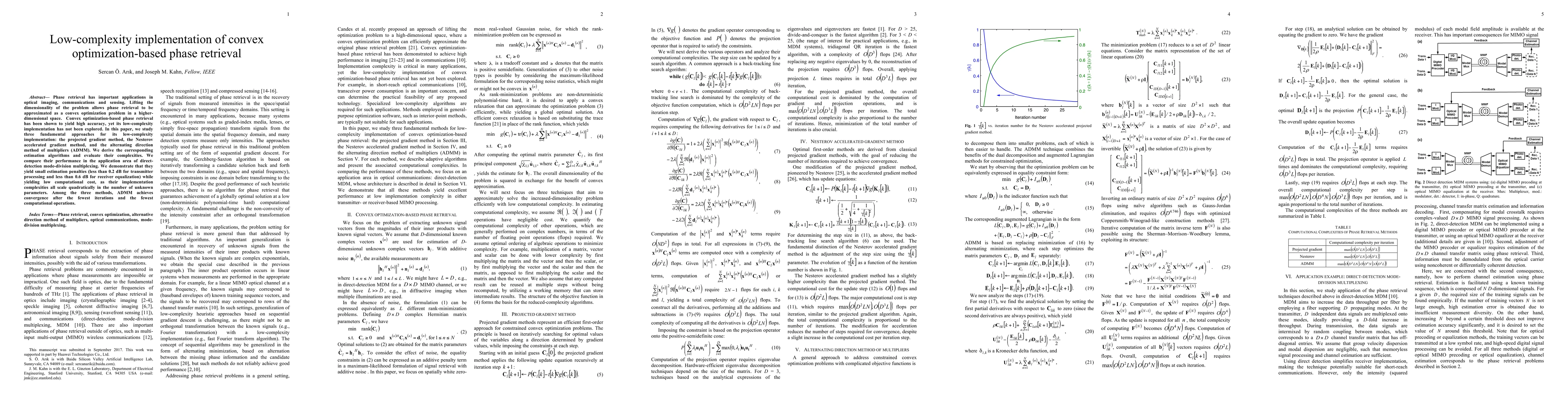 Phase retrieval has important applications in optical imaging, communications and sensing. Lifting the dimensionality of the problem allows phase retrieval to be approximated as a convex optimization problem in a higher-dimensional space. Convex optimization-based phase retrieval has been shown to yield high accuracy, yet its low-complexity implementation has not been explored. In this paper, we study three fundamental approaches for its low-complexity implementation: the projected gradient method, the Nesterov accelerated gradient method, and the alternating direction method of multipliers (ADMM) method. We derive the corresponding estimation algorithms and evaluate their complexities. We compare their performance in the application area of direct-detection mode-division multiplexing. We demonstrate that they yield negligible estimation penalties (less than 0.2 dB for transmitter processing and less than 0.6 dB for receiver equalization) while yielding low computational cost, as their implementation complexities all scale quadratically in the number of unknown parameters. Among the three methods, ADMM achieves convergence after the smallest number of iterations.