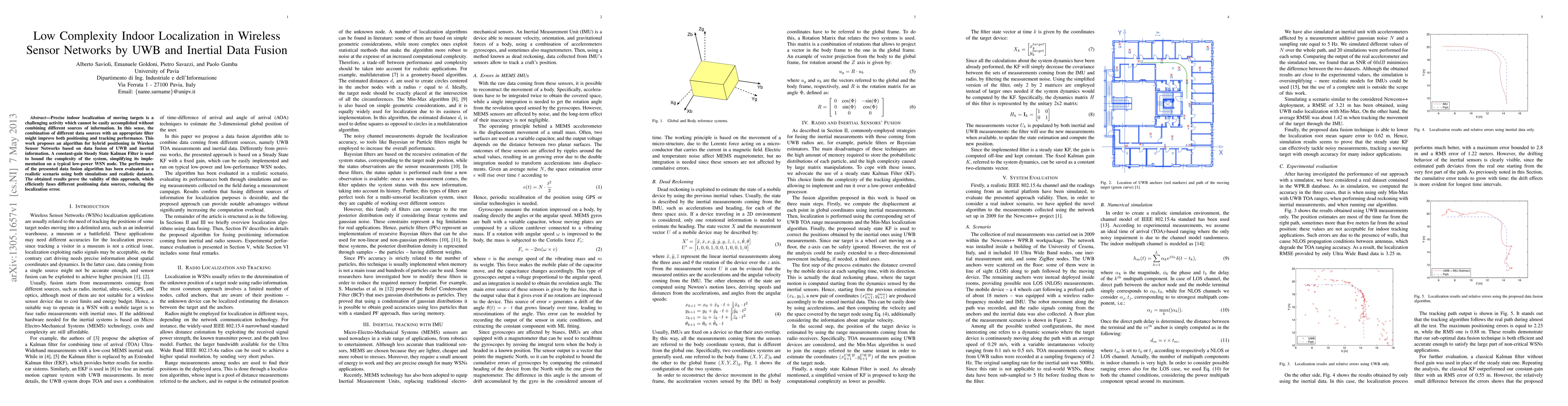 This paper proposes an algorithm for low complexity indoor localization using data fusion of Ultra-Wideband (UWB) and inertial sensors in Wireless Sensor Networks (WSN). The approach employs a constant-gain Steady State Kalman Filter to enhance positioning accuracy while maintaining system simplicity for low-power WSN nodes.