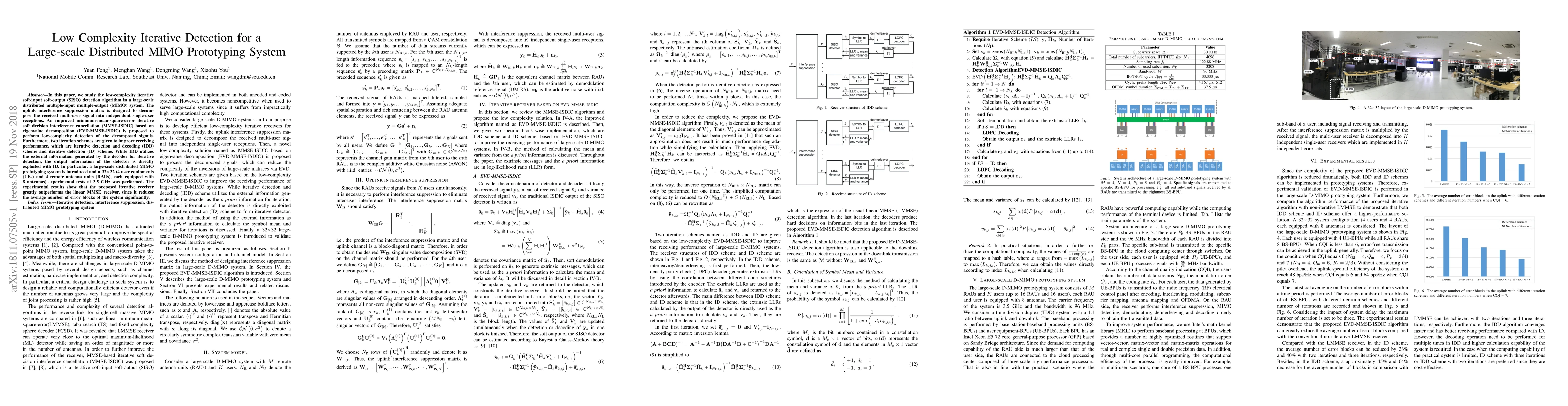 This paper proposes a low-complexity iterative detection algorithm for a large-scale distributed MIMO system, utilizing an improved MMSE-ISDIC method. Experimental results on a 32$ \times $32 MIMO prototype show significant performance improvements over the linear MMSE receiver.