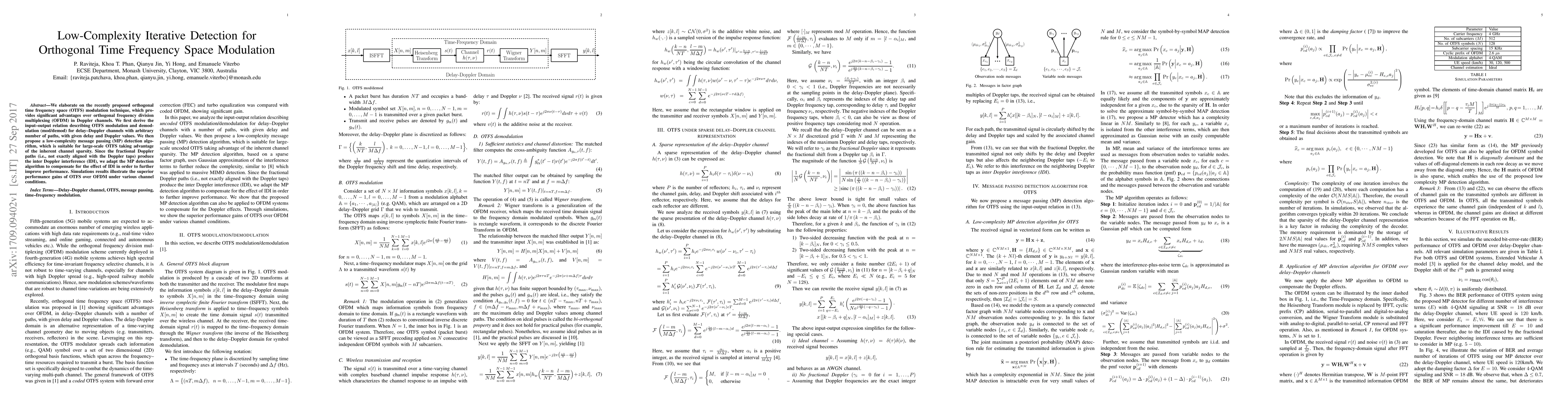 We elaborate on the recently proposed orthogonal time frequency space (OTFS) modulation technique, which provides significant advantages over orthogonal frequency division multiplexing (OFDM) in Doppler channels. We first derive the input--output relation describing OTFS modulation and demodulation (mod/demod) for delay--Doppler channels with arbitrary number of paths, with given delay and Doppler values. We then propose a low-complexity message passing (MP) detection algorithm, which is suitable for large-scale OTFS taking advantage of the inherent channel sparsity. Since the fractional Doppler paths (i.e., not exactly aligned with the Doppler taps) produce the inter Doppler interference (IDI), we adapt the MP detection algorithm to compensate for the effect of IDI in order to further improve performance. Simulations results illustrate the superior performance gains of OTFS over OFDM under various channel conditions.