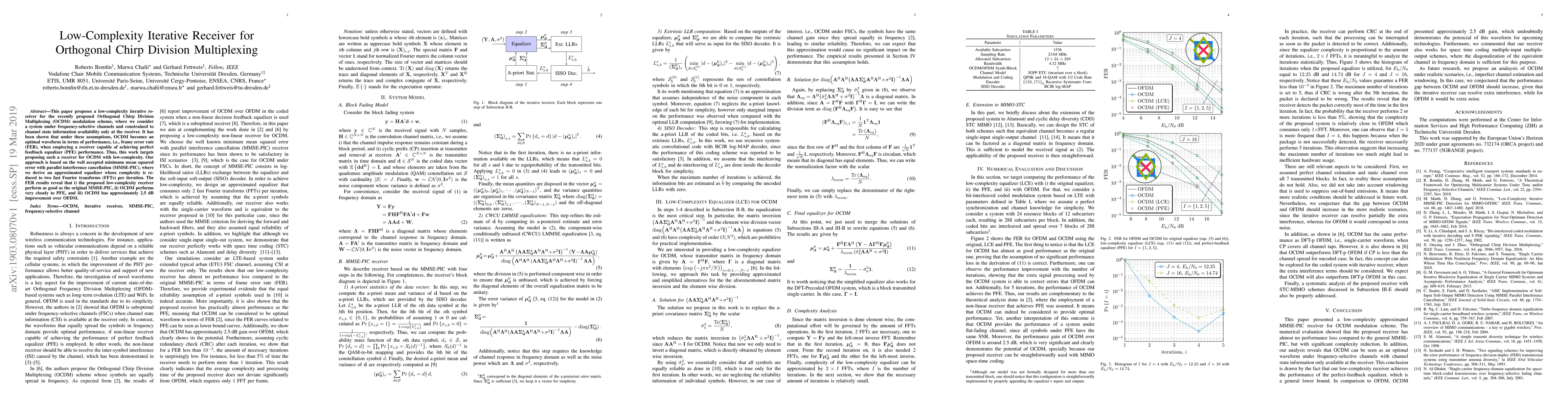 This paper introduces a low-complexity iterative receiver for Orthogonal Chirp Division Multiplexing (OCDM) using MMSE-PIC, achieving near-optimal performance with only two FFTs per iteration. The results show that the proposed receiver performs comparably to the original MMSE-PIC, and OCDM offers a 2.5 dB improvement over OFDM.