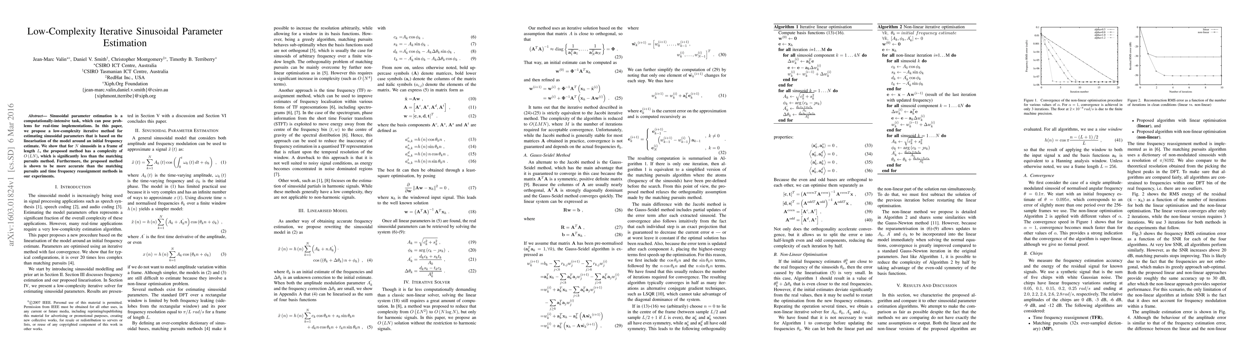 Sinusoidal parameter estimation is a computationally-intensive task, which can pose problems for real-time implementations. In this paper, we propose a low-complexity iterative method for estimating sinusoidal parameters that is based on the linearisation of the model around an initial frequency estimate. We show that for N sinusoids in a frame of length L, the proposed method has a complexity of O(LN), which is significantly less than the matching pursuits method. Furthermore, the proposed method is shown to be more accurate than the matching pursuits and time frequency reassignment methods in our experiments.